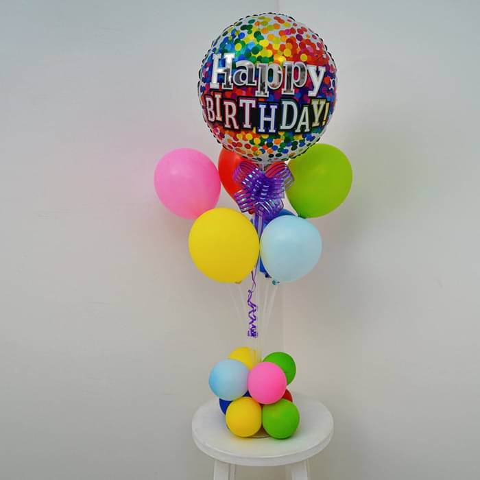 This cheerful and fun birthday balloon arrangement is designed to bring joy and excitement to any birthday celebration. The combination of a large, festive foil balloon with a "Happy Birthday" message and vibrant latex balloons in various colors makes it a lively and eye-catching display. The add...