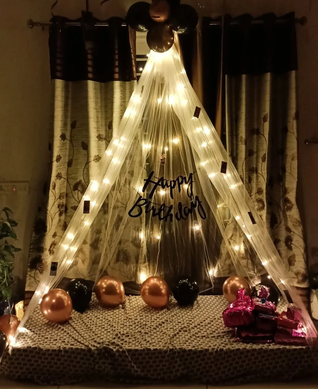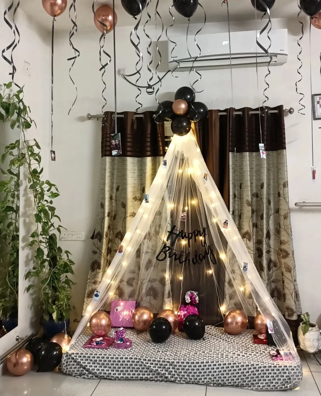This romantic and cozy birthday setup features a beautifully draped tent decorated with fairy lights, black and rose gold balloons, and personalized photo memories. The boho-style tent creates an intimate and warm atmosphere, making it perfect for a romantic surprise, indoor celebration, or a spe...