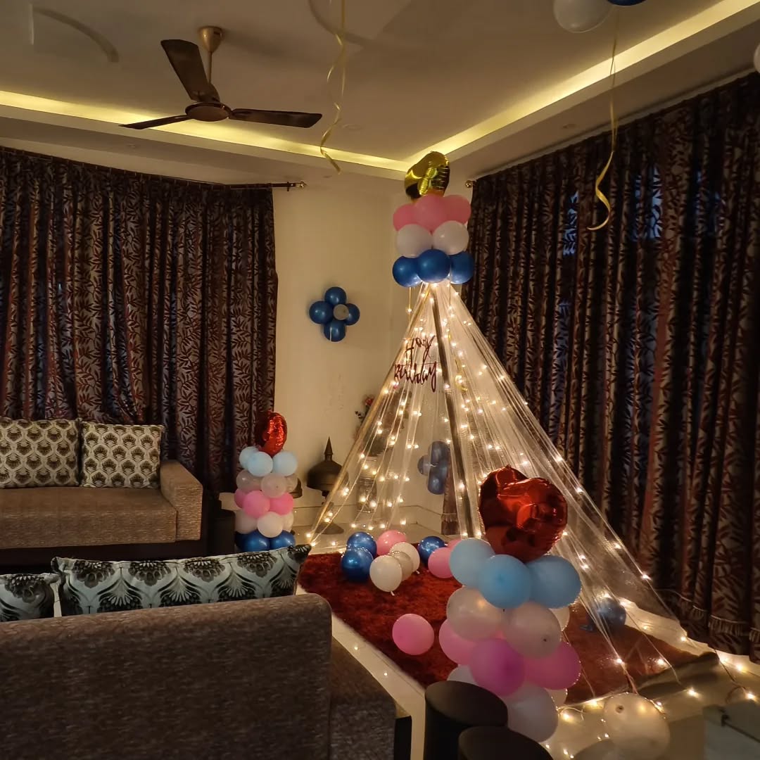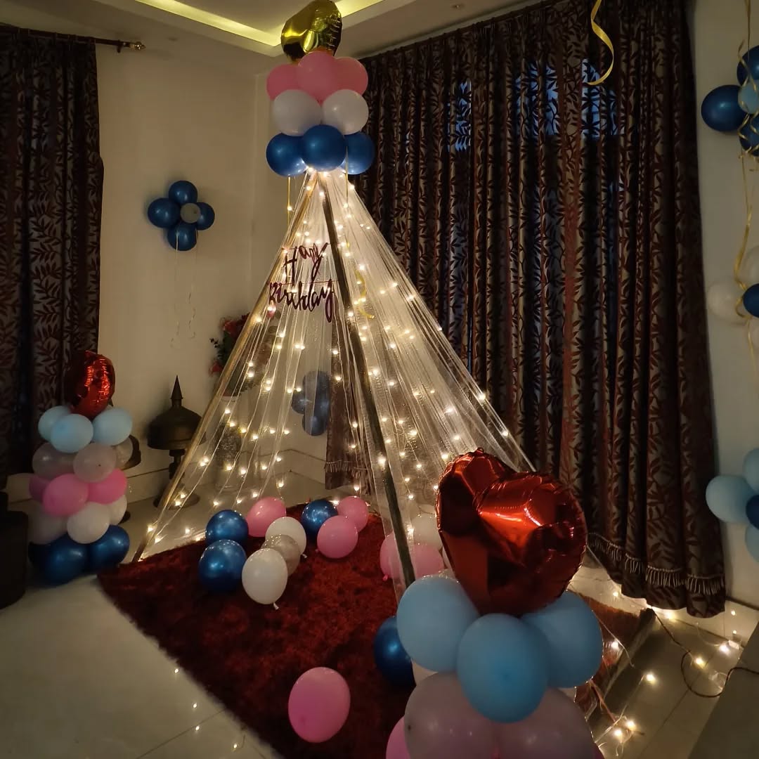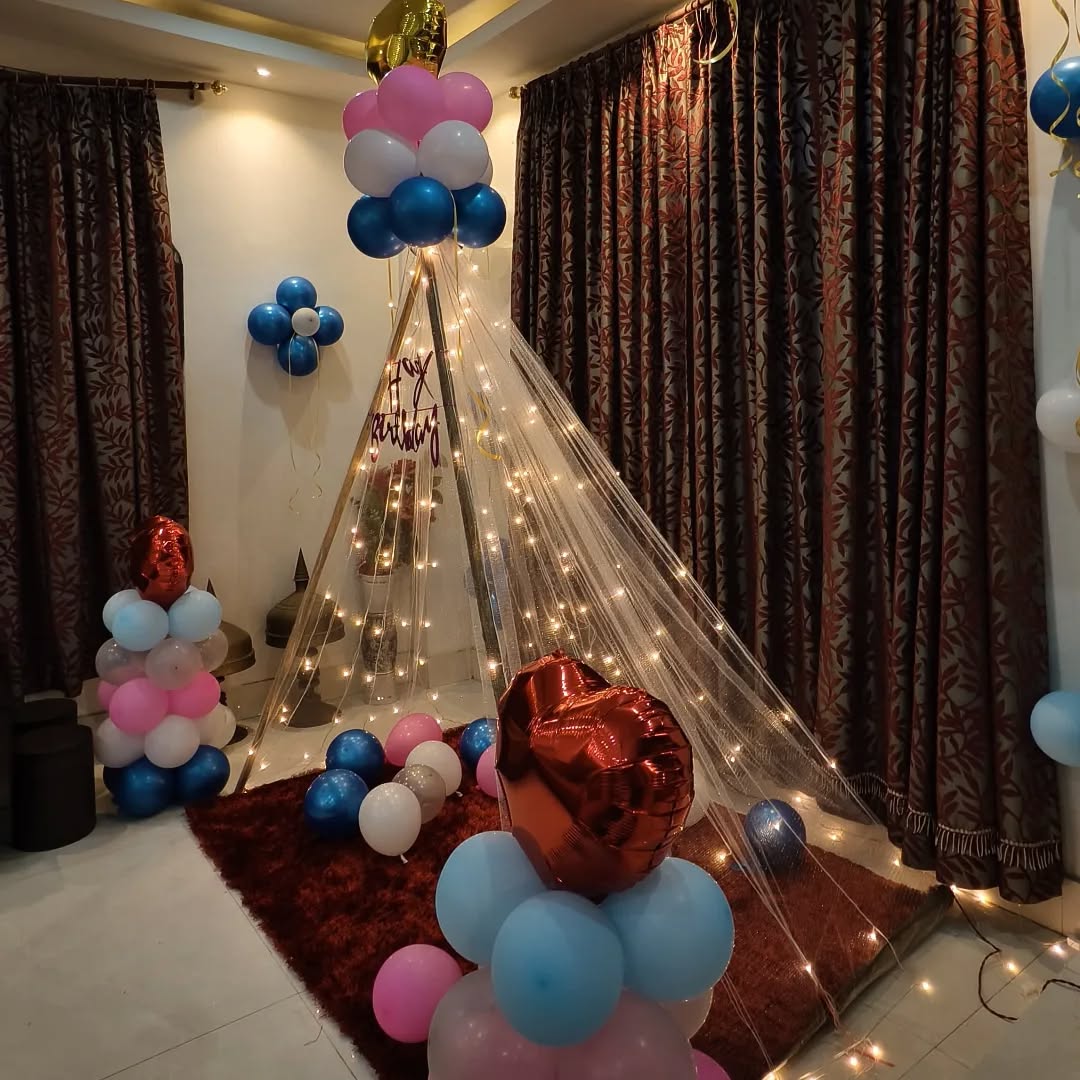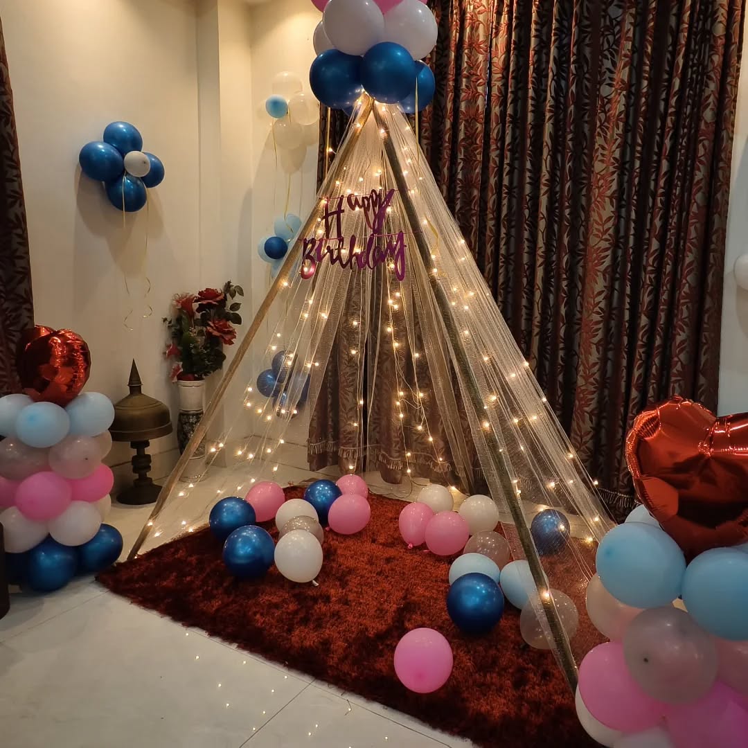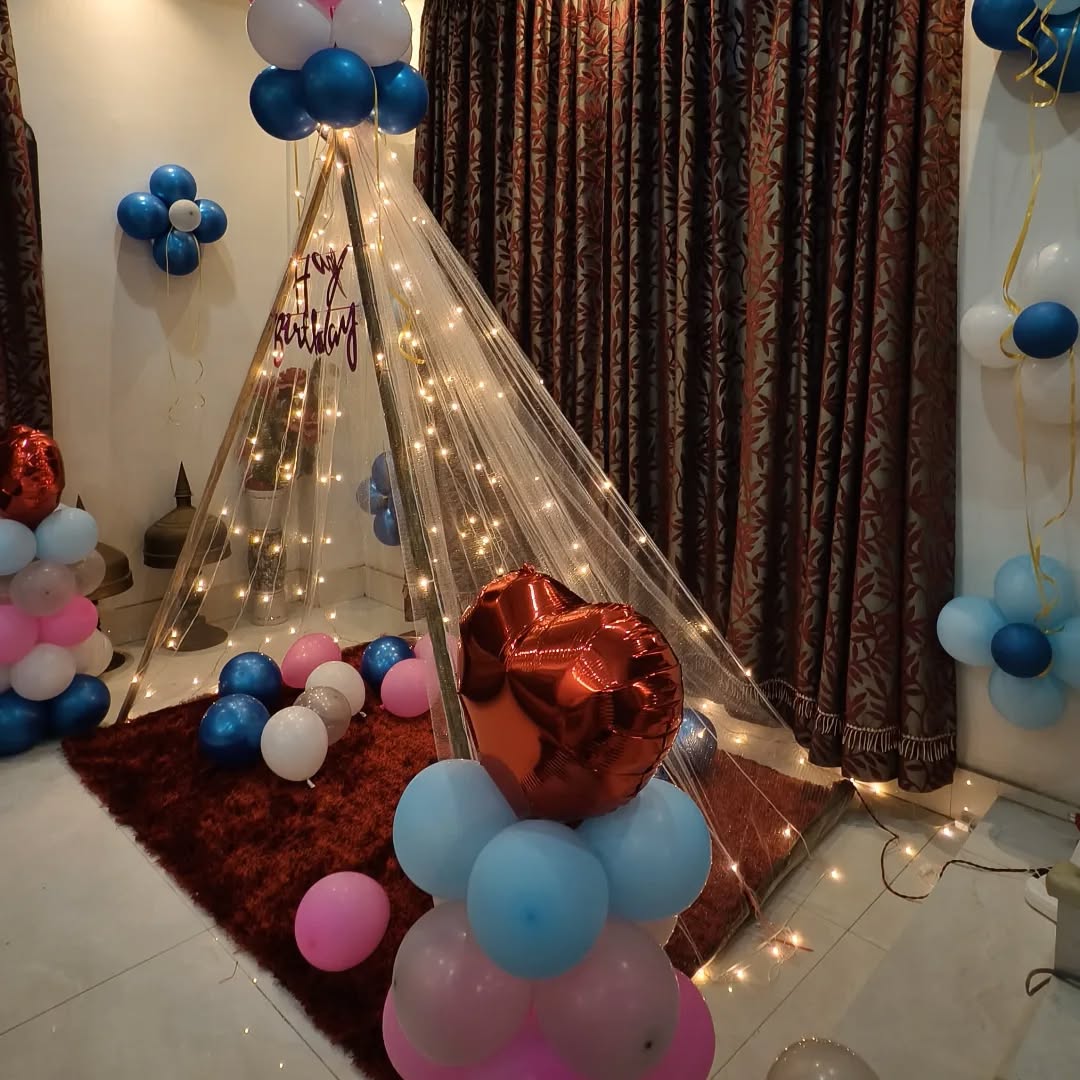 Create a magical and intimate birthday experience with this beautifully lit teepee tent decoration. This setup features a soft, glowing canopy with fairy lights, pastel and metallic balloons, and a plush rug for an elegant and cozy celebration. Ideal for romantic surprises, intimate birthdays, an...
