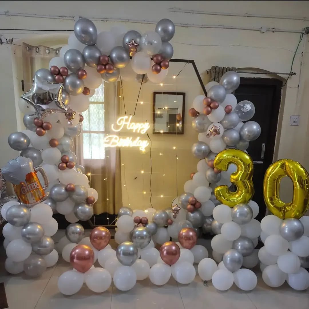 The Elegant 30th Birthday Balloon Decor is a luxurious and sophisticated setup that celebrates a milestone birthday. Featuring a glamorous combination of white, silver, and rose gold balloons, this design exudes elegance and class. The glowing "Happy Birthday" neon sign adds a warm and festive am...