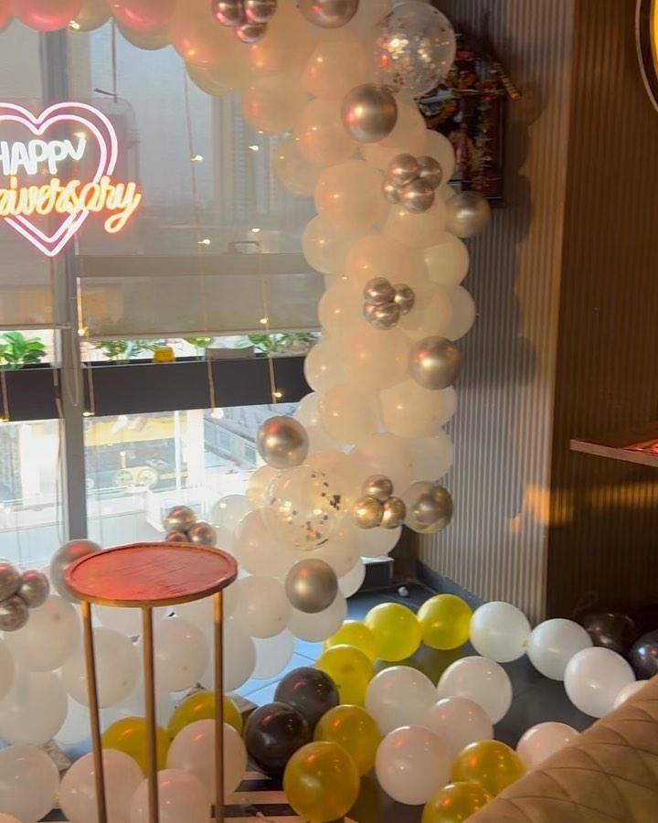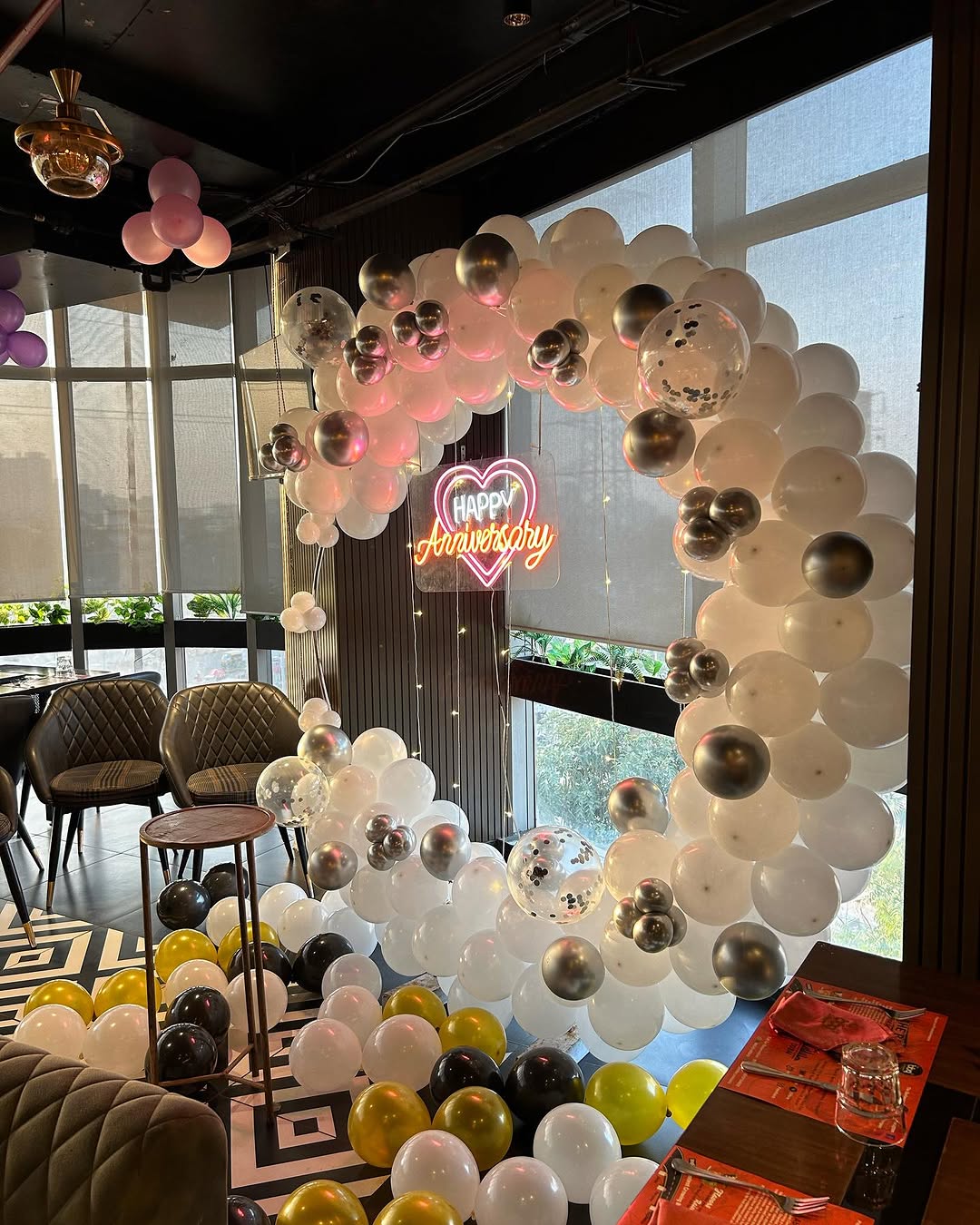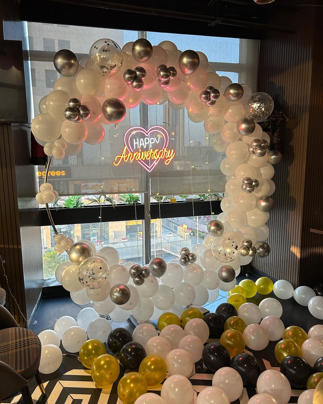Celebrate love and togetherness with this Elegant Anniversary Balloon Arch, featuring a stunning blend of white, silver, black, and gold balloons. The semi-circle balloon arrangement is attached to a sleek metal frame, enhanced with chrome silver and transparent confetti-filled balloons for a tou...