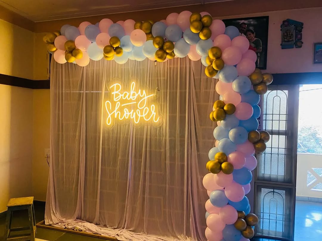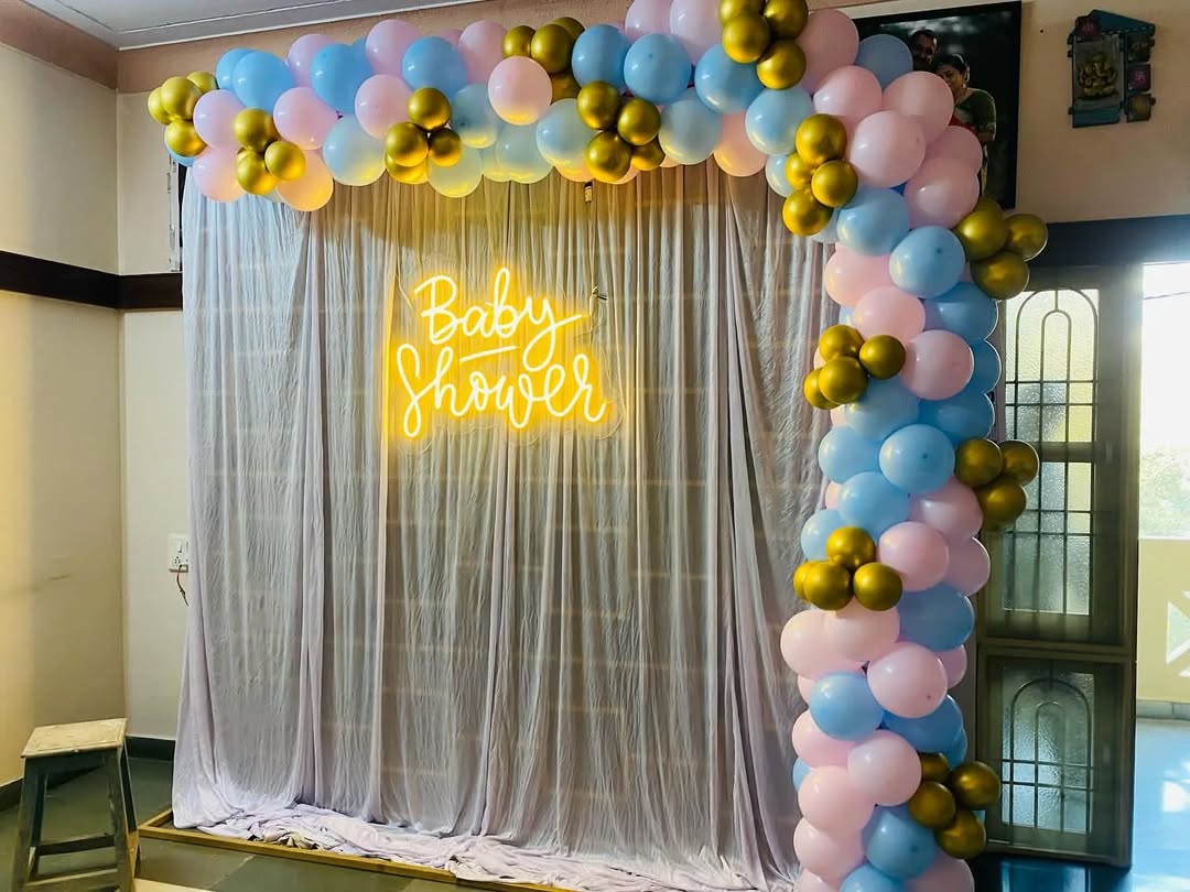 This Baby Shower Decoration Setup features a stunning balloon arch in pastel pink, blue, and gold to create a soft, dreamy ambiance. The setup includes a sheer white drape backdrop, adding an elegant and airy feel to the space. A warm LED "Baby Shower" sign enhances the visual appeal, making it a...