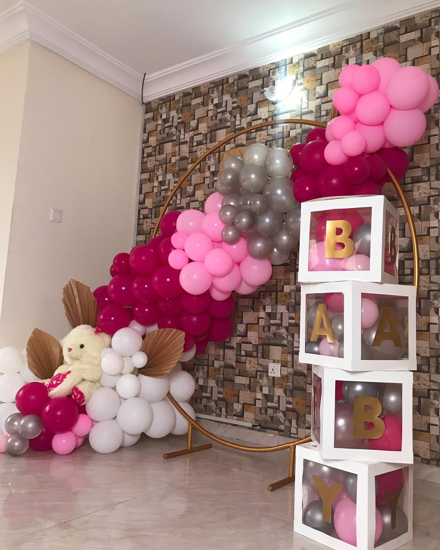 This luxurious baby shower decoration features a golden circular balloon arch with an elegant blend of pink, burgundy, white, and metallic silver balloons. The design is enhanced with a soft plush teddy bear, adding a cozy and heartwarming touch. Additionally, the BABY letter box tower filled wit...