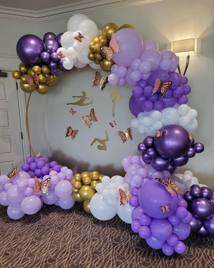 *️⃣This luxurious ballerina-themed balloon arch creates a stunning and sophisticated backdrop for events such as birthday parties, dance recitals, or ballet-themed celebrations. The *️⃣combination of deep purple, lavender, white, and gold balloons, along with butterfly de...