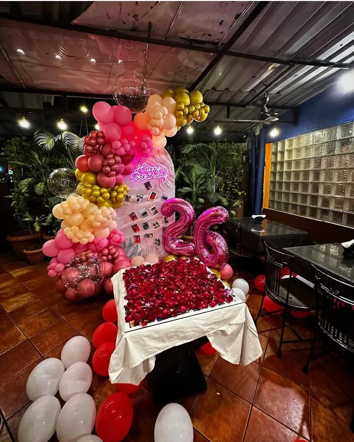 This stunning birthday setup features a vibrant balloon cascade blending shades of pink, peach, gold, and white for a luxurious and modern aesthetic. The balloons are arranged in an organic garland style, giving it a soft yet eye-catching effect. A customized backdrop with a "Happy Birthd...