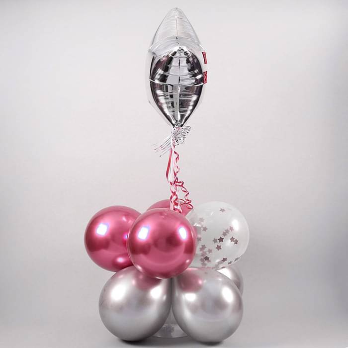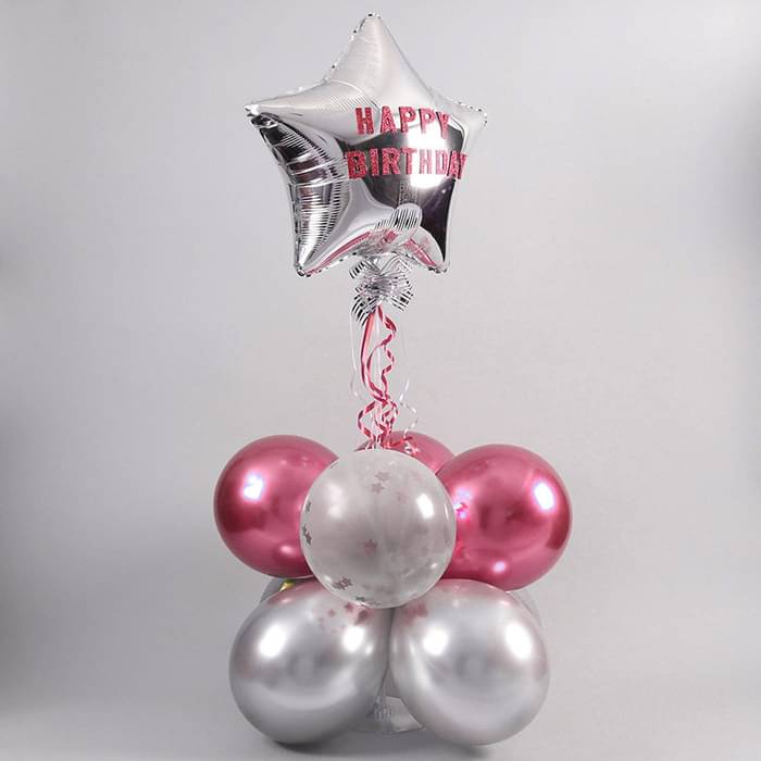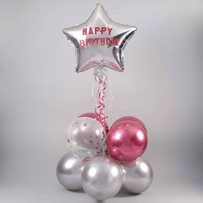 This sophisticated birthday balloon arrangement features a silver star-shaped foil balloon with "HAPPY BIRTHDAY" written in pink letters, floating above a base of silver, pink, and white balloons. Some balloons have a confetti or star-print pattern, adding a stylish and festive touch. The design ...