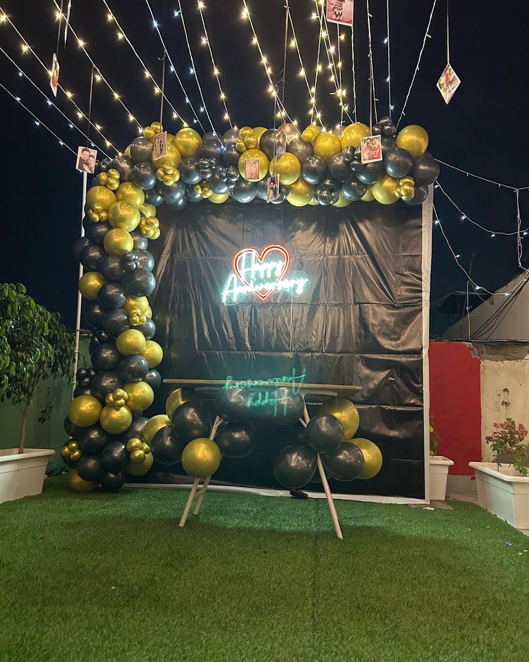 *️⃣This stunning anniversary backdrop features a luxurious combination of black and gold balloons, paired with a sleek black fabric background and an elegant "Happy Anniversary" neon sign. The *️⃣warm string lights with hanging pictures create a romantic and personalized ambiance, making it perfe...