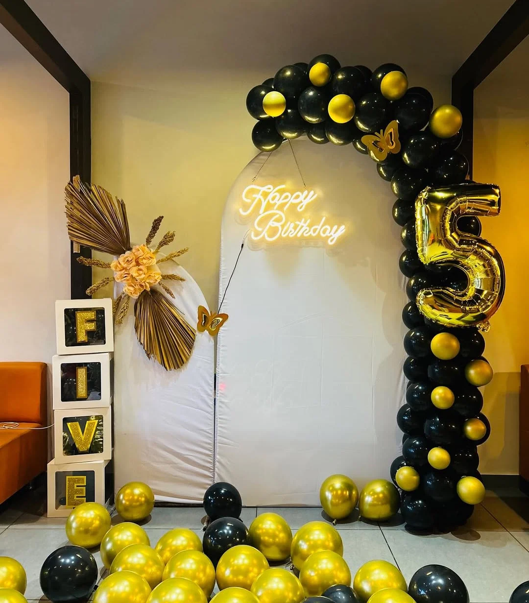 This black and gold birthday setup is a stylish and modern decoration, perfect for a 5th birthday celebration. The combination of gold and black balloons gives a luxurious and premium look. A neon "Happy Birthday" sign adds a warm and elegant glow, making the setup perfect for photoshoots and mem...