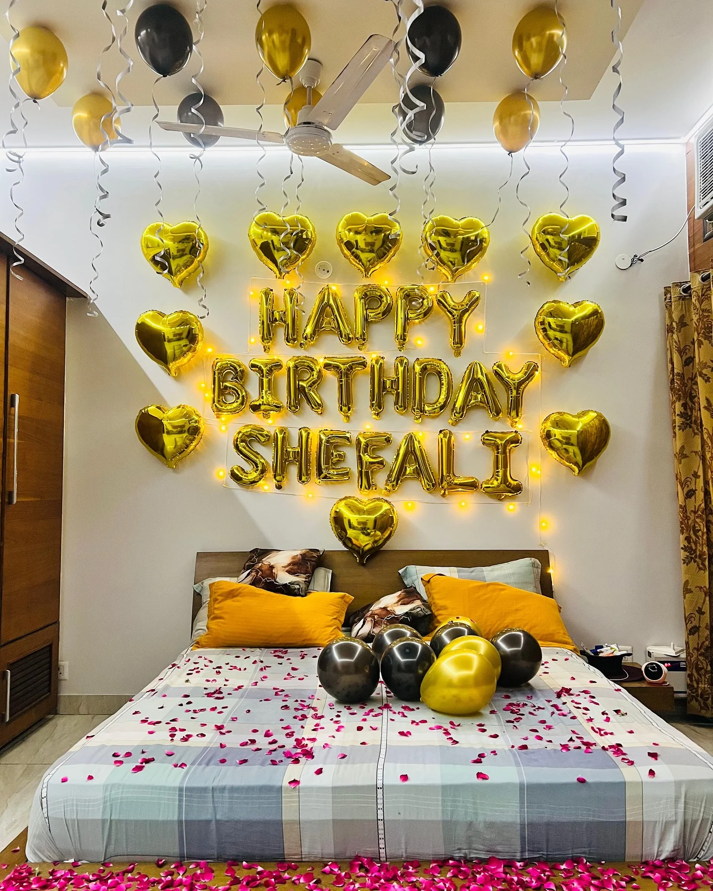This luxurious black and gold birthday decoration creates a stylish and elegant atmosphere. The golden "HAPPY BIRTHDAY SHEFALI" foil balloons, surrounded by gold heart balloons and warm fairy lights, give a premium feel to the setup. Floating black and gold ceiling balloons with ribbons add a dra...