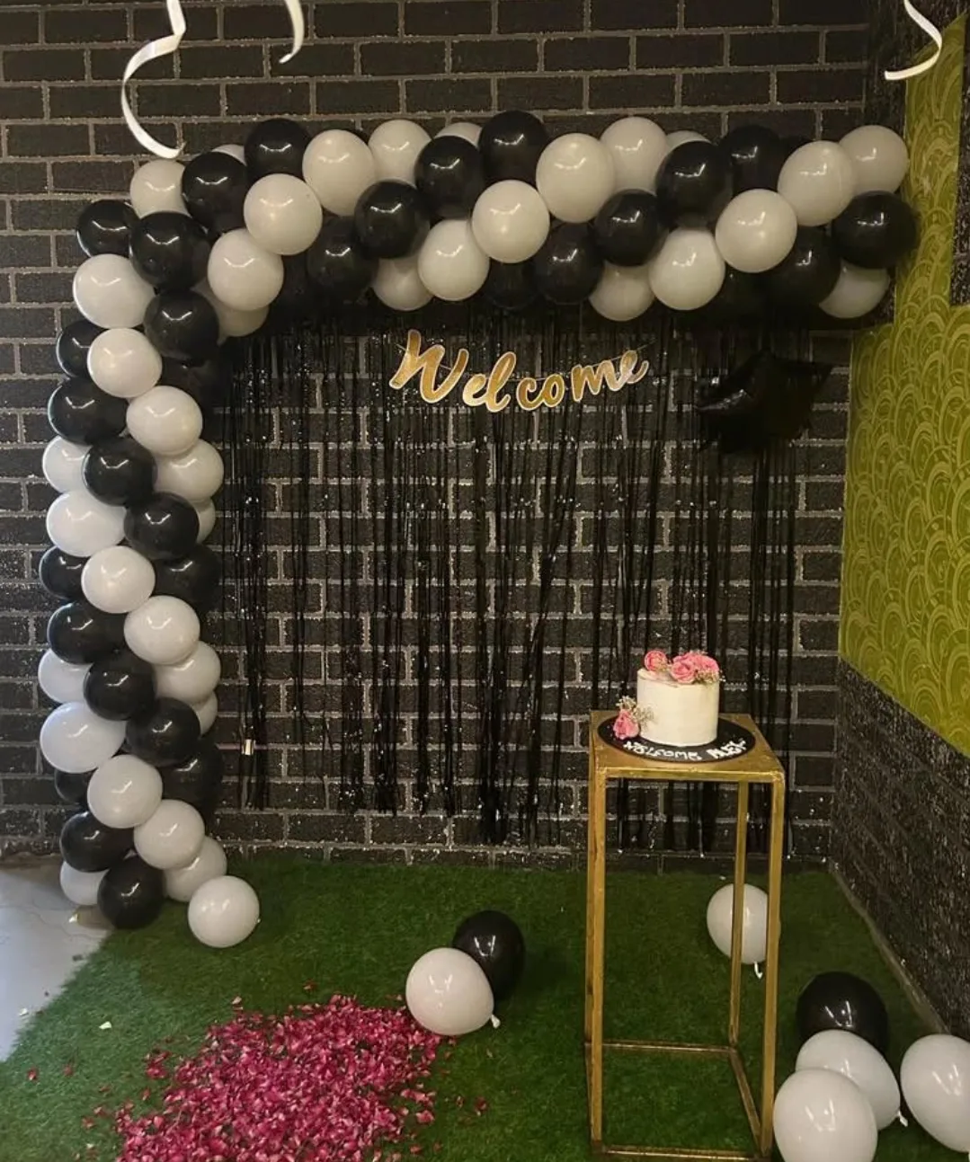 This modern and stylish balloon decoration features a black and white color theme, perfect for formal events, birthdays, or corporate gatherings. The gold "Welcome" sign, combined with a black tinsel curtain backdrop, adds a sophisticated touch. A minimalist cake table with floral accents complet...