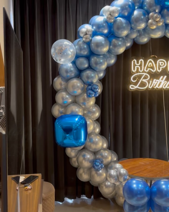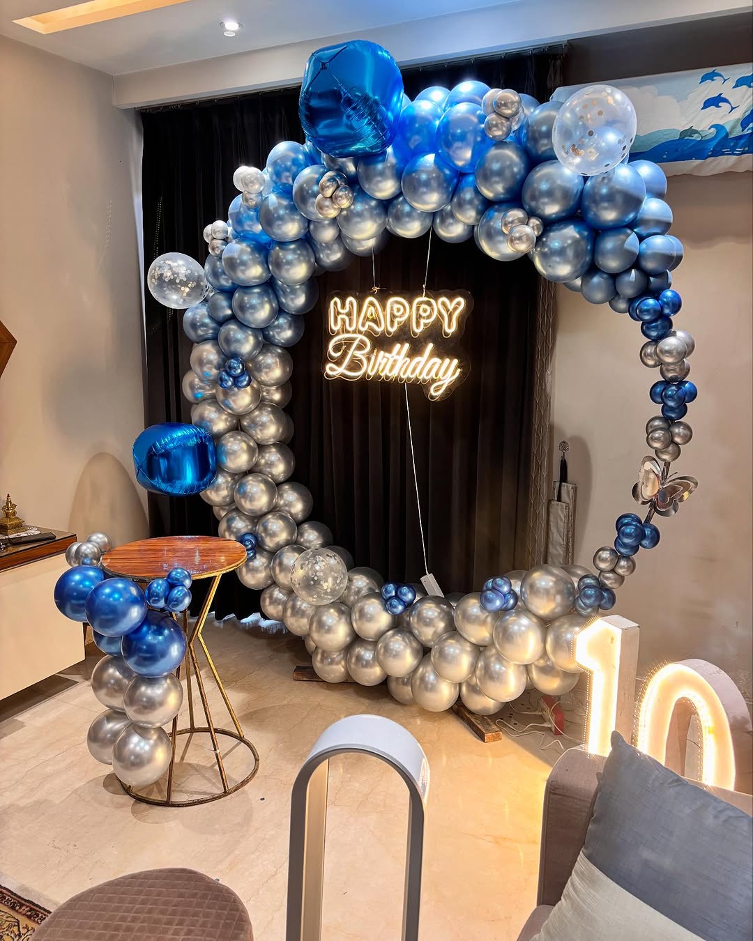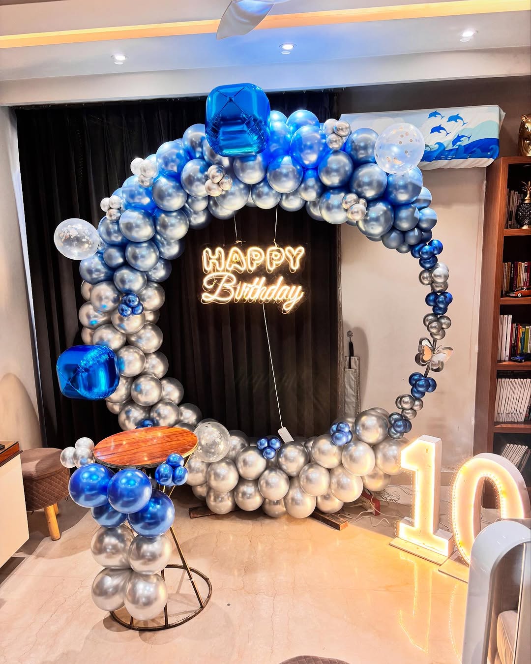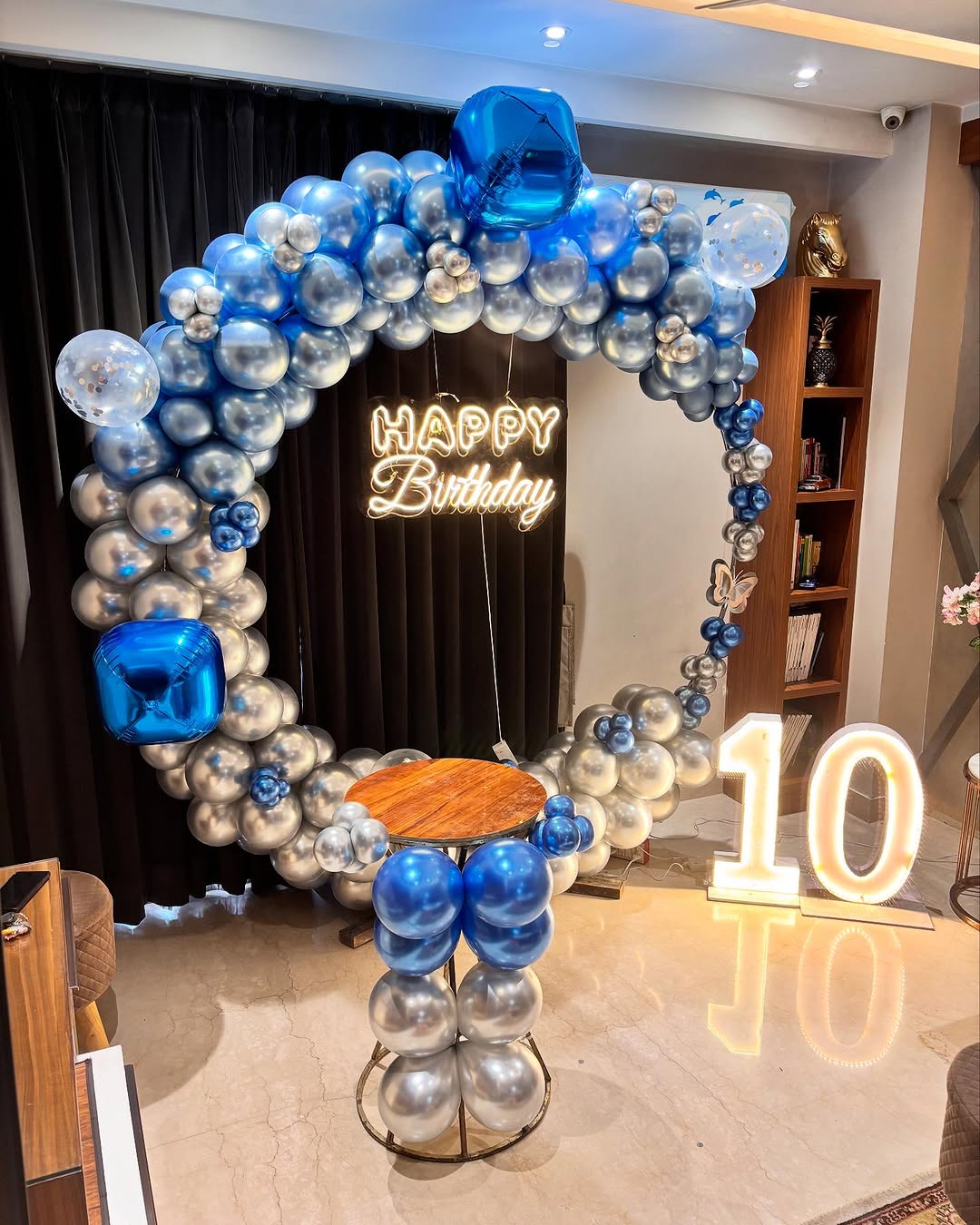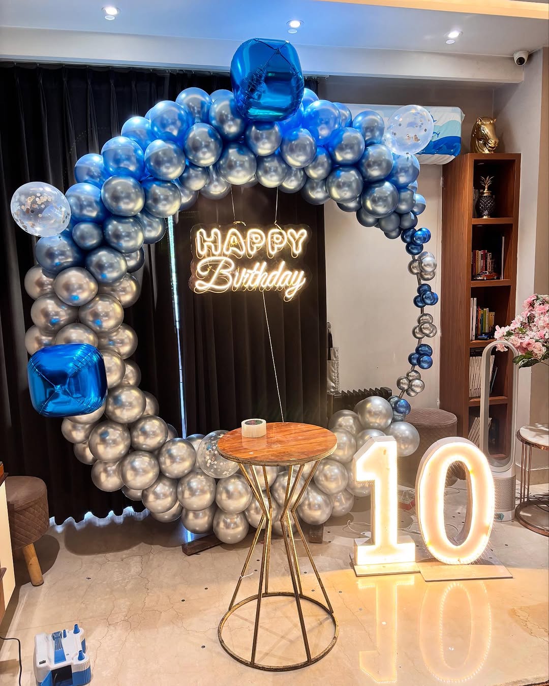 This birthday setup features a stunning half-circle balloon arch in shades of blue and silver, giving a luxurious and modern look. The setup includes a neon "Happy Birthday" sign and large illuminated numbers "10" for a personalized touch. A small wooden high-top table adds a central focus,...