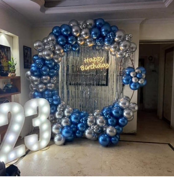 This stunning and sophisticated balloon hoop backdrop is perfect for adult birthdays, milestone celebrations, and luxury parties. The design features a large circular metal hoop, elegantly decorated with metallic blue and silver balloons for a modern and classy touch.