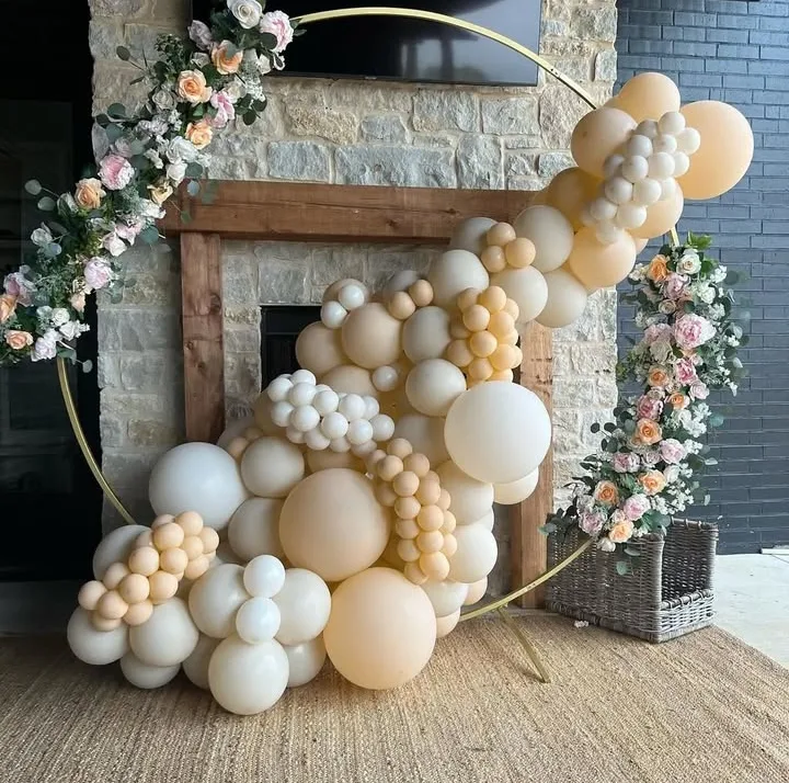 This neutral-toned balloon decoration features a stunning combination of white, cream, and beige balloons, creating a sophisticated and elegant look. The arrangement is set on a gold circular frame, beautifully complemented by floral garlands in soft pastel shades. Perfect for weddings, baby show...