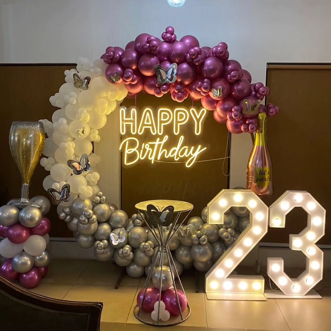 This luxurious birthday setup features a stunning half-arch balloon arrangement in metallic purple, white, and silver tones. The "Happy Birthday" neon sign, LED-lit age numbers (23), and butterfly accents add a magical touch. The champagne glass and bottle balloons make this setup perfect for an ...