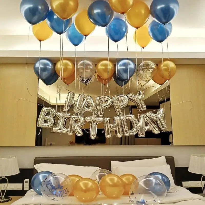 Celebrate a birthday in style with this luxurious golden and blue theme using floating helium balloons and reflective silver foil letters. Perfect for hotel rooms, bedrooms, or private indoor spaces, this design gives a classy touch to intimate birthday surprises.