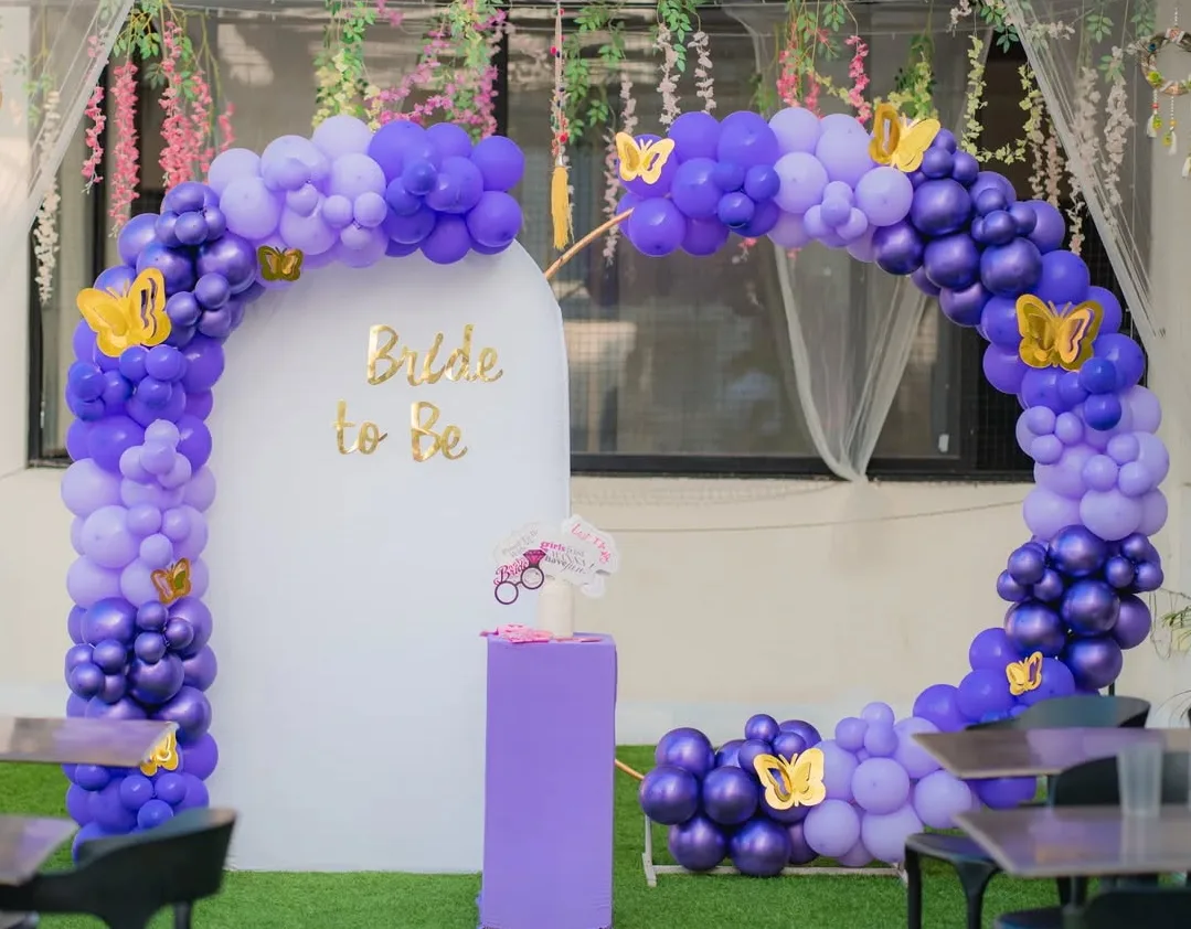 This stunning bridal shower decoration is designed for a Bride-to-Be celebration, featuring a lavender and purple-themed balloon arch with golden butterfly accents. The setup includes a white fabric backdrop with gold lettering, creating an elegant and classy ambiance. A small lavender table is p...