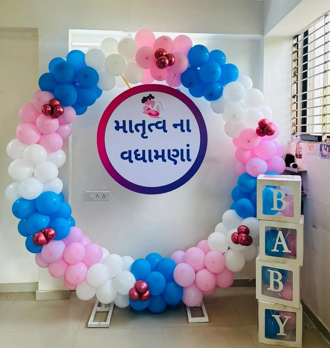 This maternity celebration decoration features a stunning circular balloon arch with pink, blue, and white balloons, symbolizing the joy of welcoming a baby. The center backdrop includes a Gujarati inscription "માતૃત્વ ના વધામણા" (Maternity Blessings), along with an illustration of a mother-to-be...