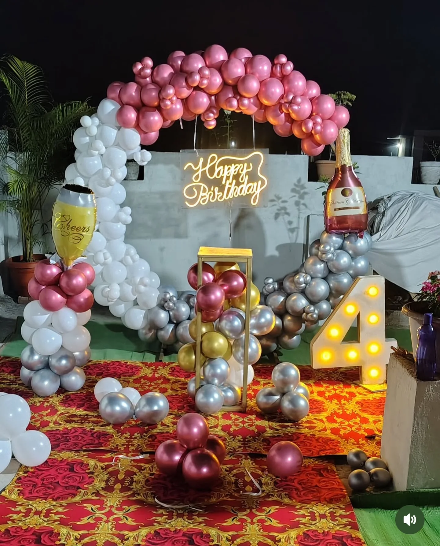 This luxurious birthday decoration features a stunning semi-circular balloon arch in white, rose gold, and silver. A glowing "Happy Birthday" neon sign serves as the centerpiece, enhancing the ambiance. The setup is completed with a golden frame filled with balloons, a large illuminated "4" marqu...