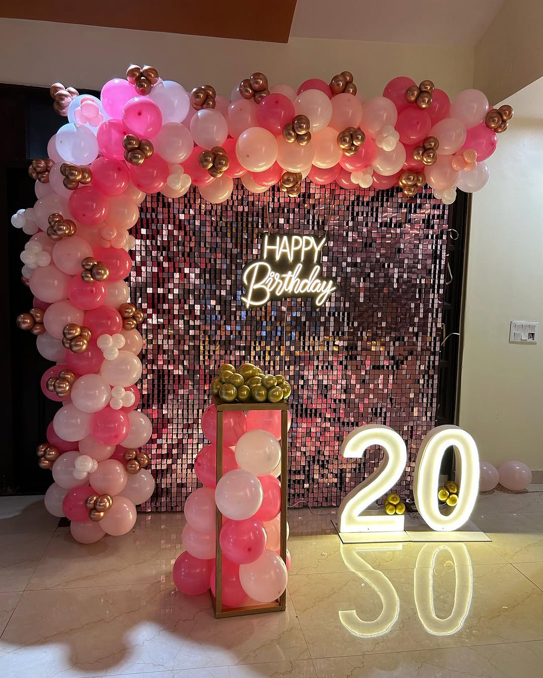 A chic and sophisticated birthday setup featuring a pink and white balloon garland with gold balloon accents for a luxurious touch. The shimmering pink sequin backdrop enhances the elegance of the design, while the "Happy Birthday" neon sign adds a modern aesthetic. The setup is completed with a ...