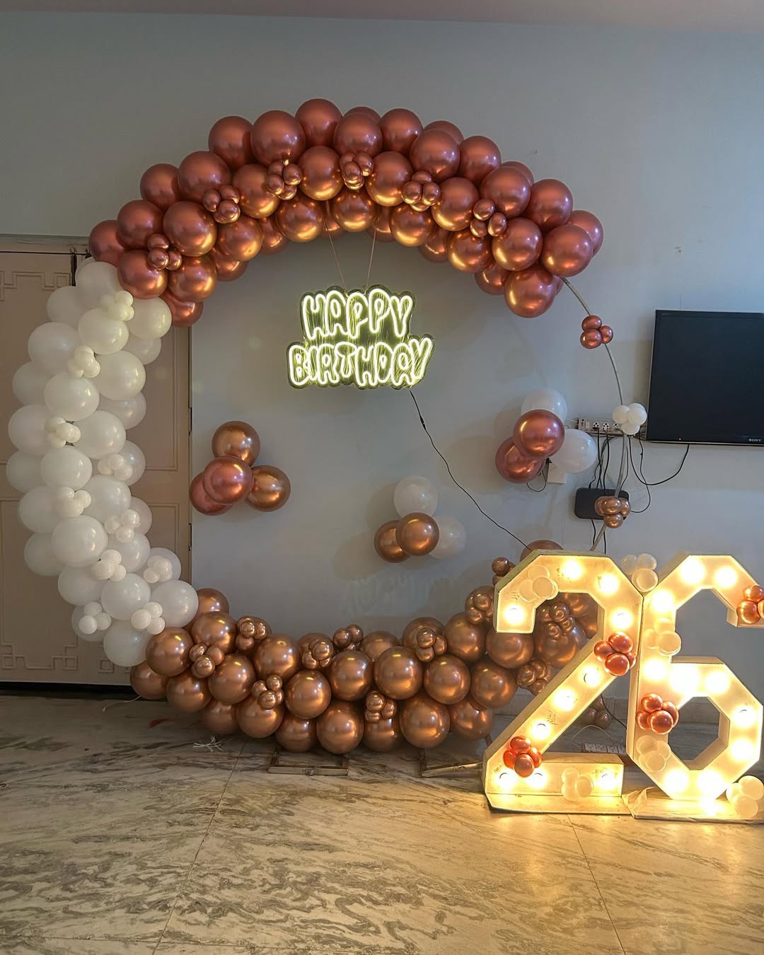 This stunning birthday backdrop features a semi-circular balloon arch in a rose gold and white color theme, creating a luxurious and modern look. The neon "Happy Birthday" sign in the center adds a trendy and stylish touch, making it a perfect setting for birthday photoshoots. The illuminated "26...