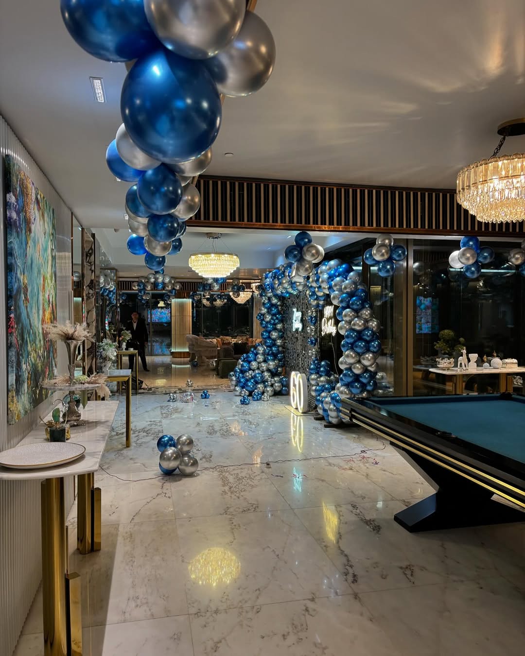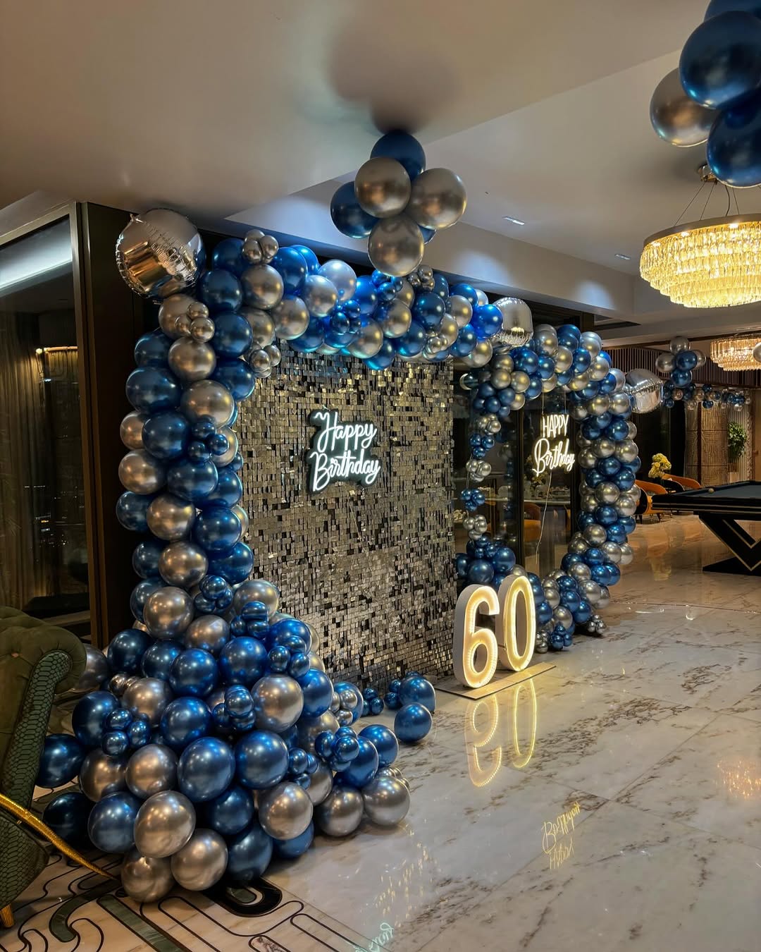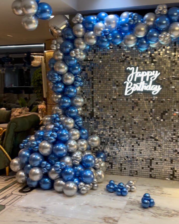 This luxurious and sophisticated birthday setup is designed for a milestone 60th birthday celebration. Featuring a glamorous silver sequin backdrop, an arch of metallic blue and silver balloons, and LED "Happy Birthday" signage, this decor adds an elegant and timeless touch. The centerpiece is a ...