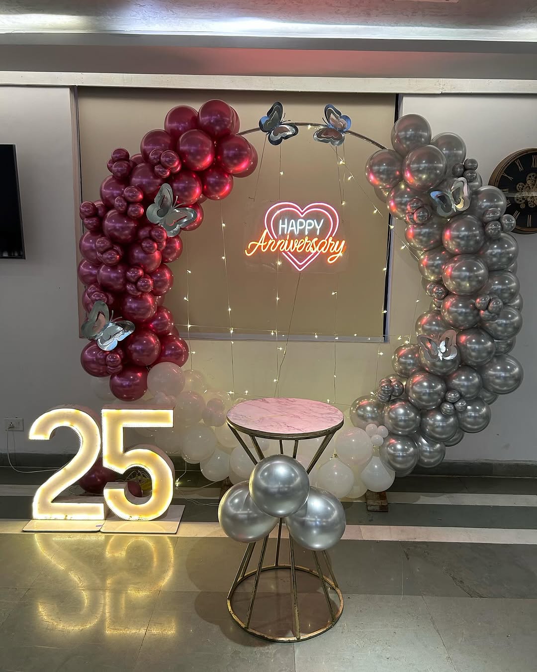 This luxurious anniversary setup is designed to celebrate 25 years of love and togetherness. The setup includes: