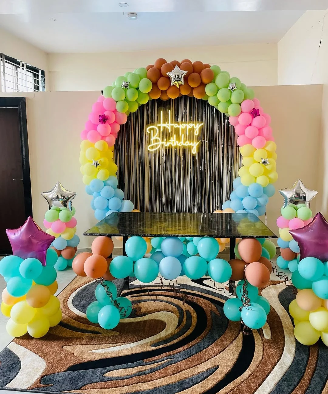 This colorful yet sophisticated birthday decoration features a grand balloon arch in pastel and earthy tones, creating a visually appealing and balanced look. The backdrop is enhanced with a neon "Happy Birthday" sign and a stylish black and gold tinsel curtain, adding depth and elegance. The set...