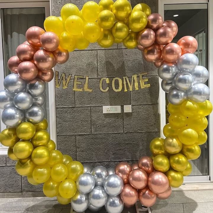 This Elegant Welcome Balloon Arch is designed for creating a luxurious first impression at various events such as weddings, corporate gatherings, or milestone birthday parties. The use of gold, silver, and rose gold balloons offers a classy and sophisticated aesthetic. The metallic shine of the b...