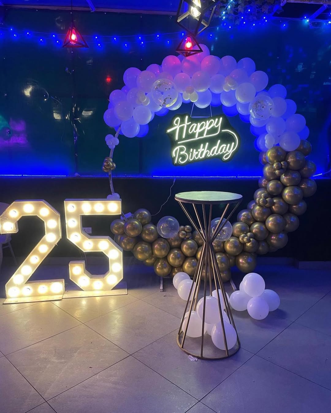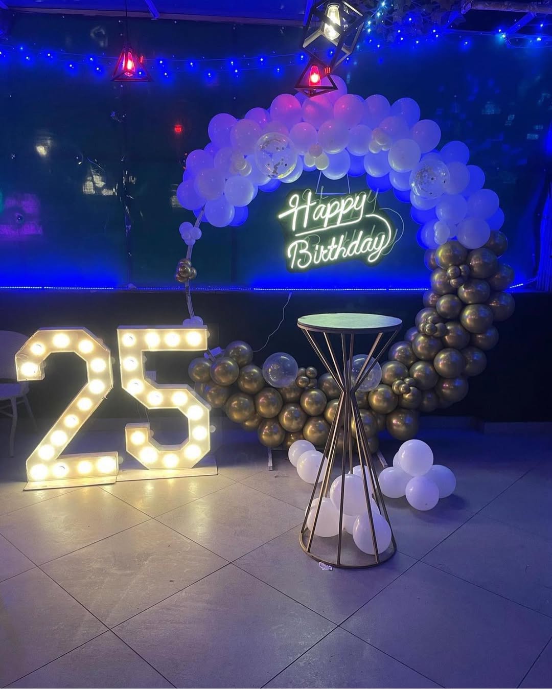*️⃣ This sophisticated birthday setup features a half-arch balloon arrangement in white and gold. A neon "Happy Birthday" sign enhances the modern aesthetic, while a large illuminated "25" serves *️⃣as a centerpiece. The setup is complemented by a gold-framed round table with a marble top, a...