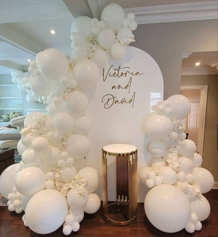 This is a premium all-white balloon decoration with a luxury touch, designed for weddings, engagements, anniversaries, receptions, bridal showers, or classy celebrations. The combination of all-white balloons, minimal floral touches, and a glossy backdrop creates a sophisticated and elegant atmos...