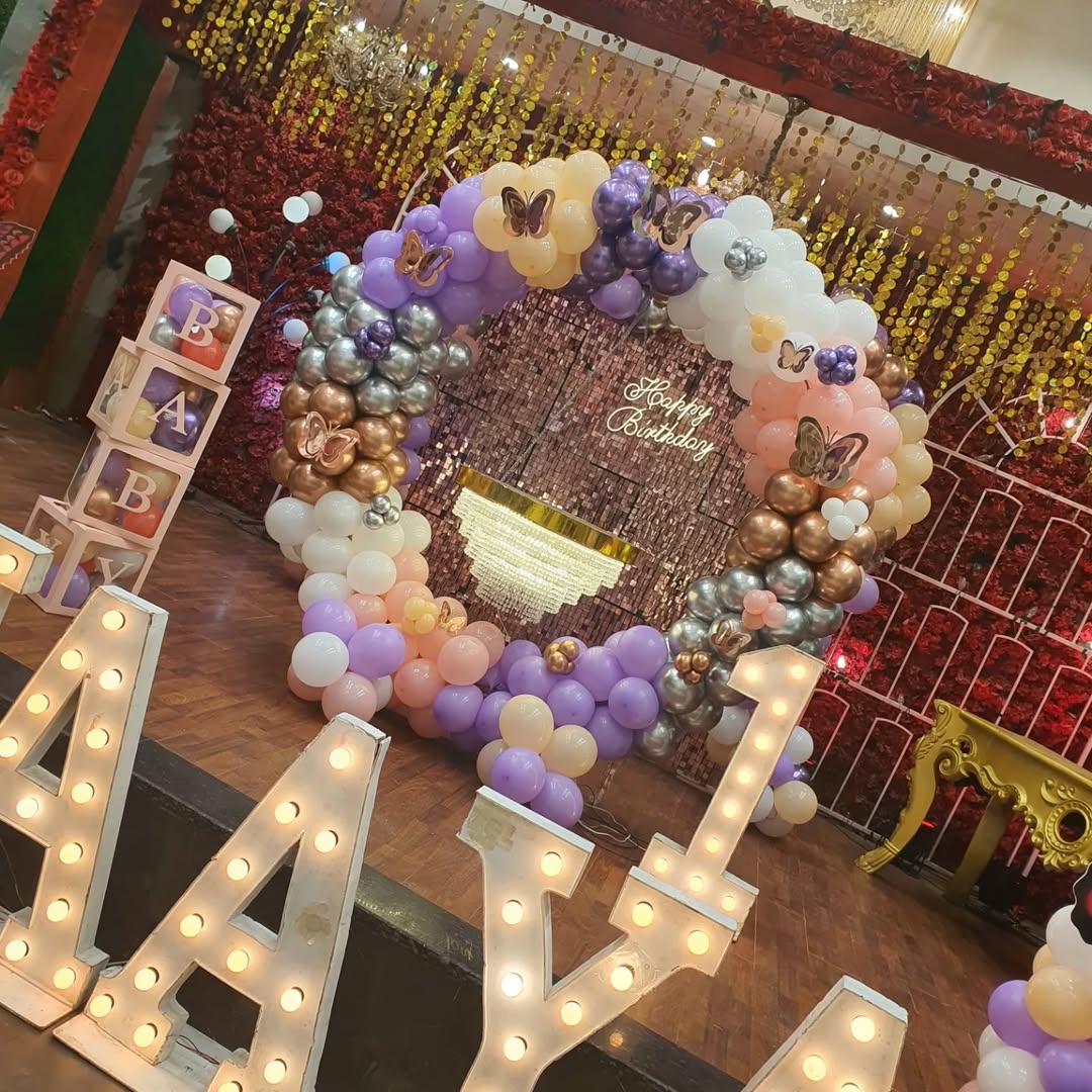 ✯ ✯ This birthday stage decoration features a butterfly and balloon theme, perfect for a child's first birthday celebration. The centerpiece consists of a circular balloon arch in pastel shades of purple, pink, white, and gold, adorned with butterfly cutouts. A "Happy Birthday" sign is placed in ...