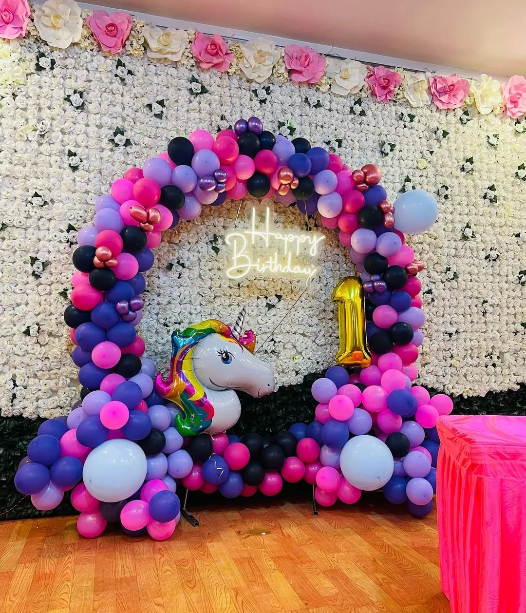 This magical unicorn-themed birthday setup features a vibrant balloon arch in shades of pink, purple, black, and metallic accents, creating a dreamy and mystical effect. The setup includes a floral wall backdrop, a neon "Happy Birthday" sign, and a large unicorn foil balloon as the focal point. A...