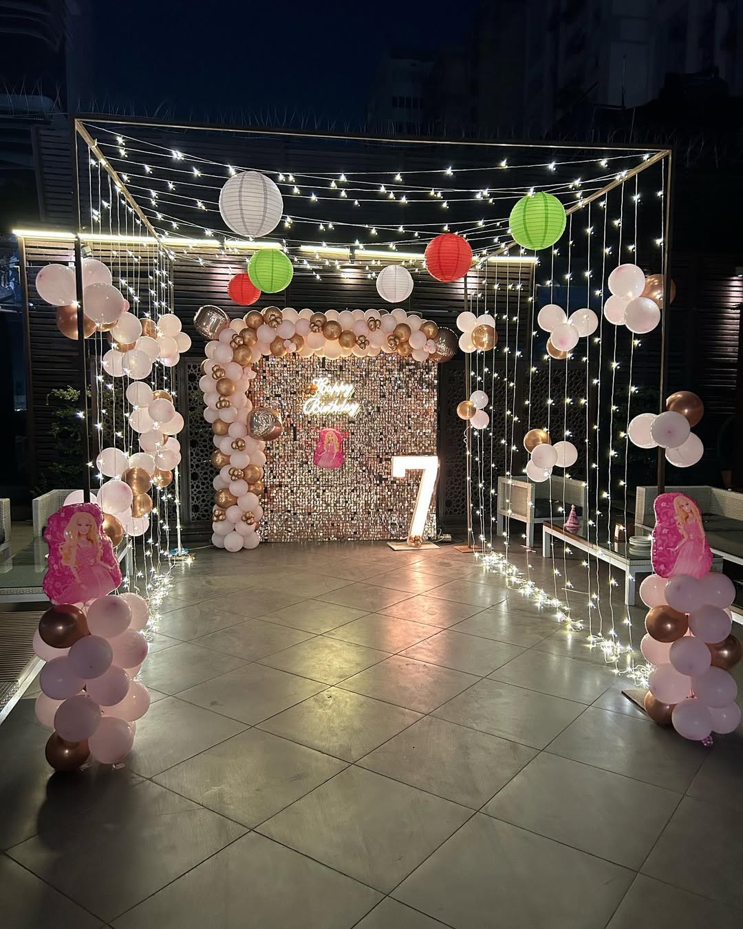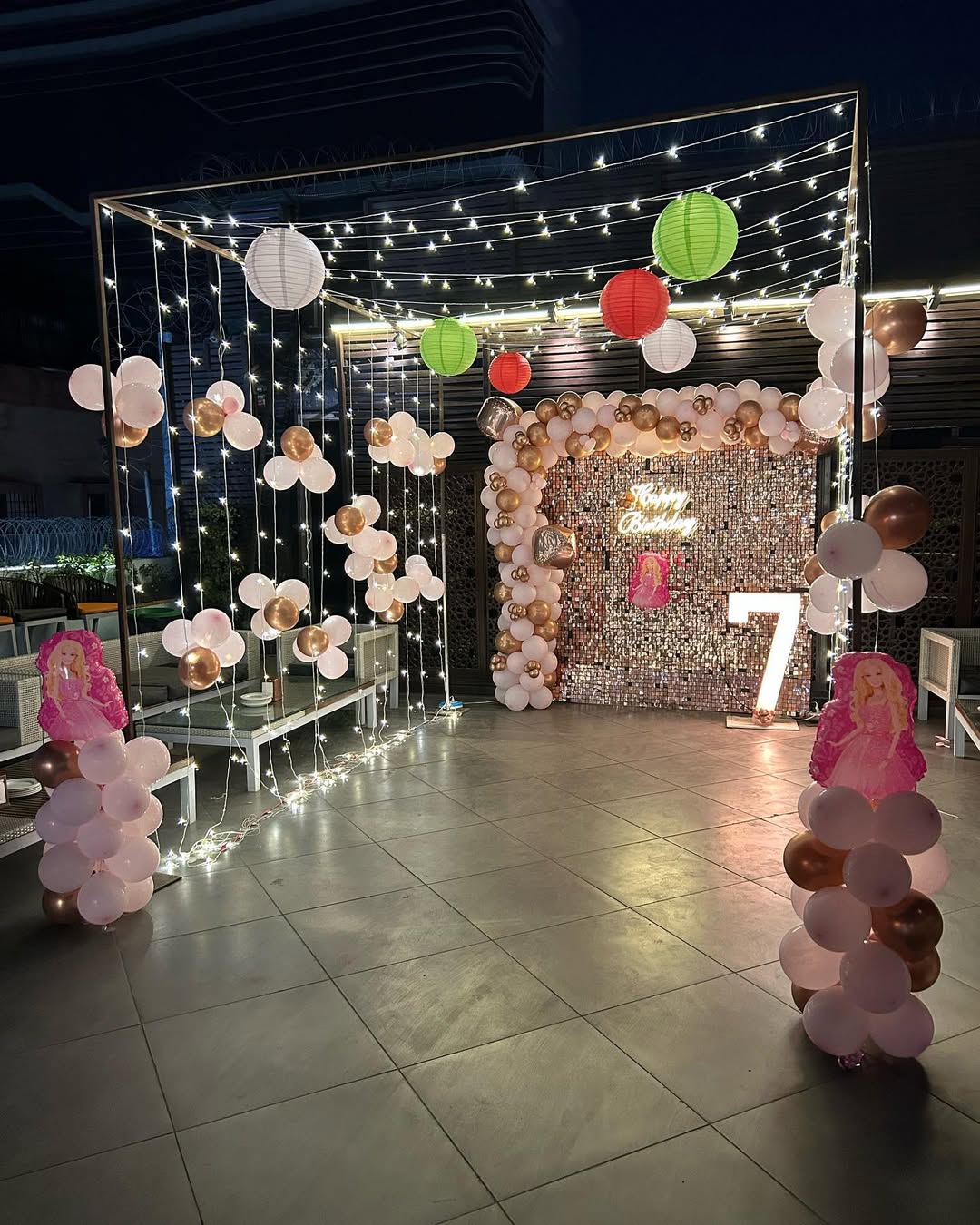 ✯✯This magical birthday setup is perfect for a princess-themed celebration! The event space features a gorgeous balloon arch in soft pink, white, and gold with metallic highlights. A shimmering sequin backdrop enhances the elegance, with a glowing "Happy Birthday" neon sign. The illuminated numbe...
