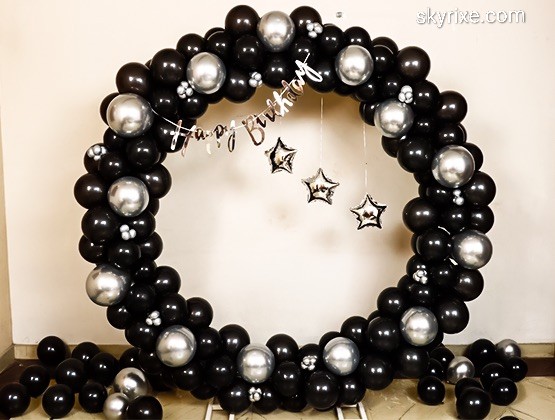 Create a bold and sophisticated celebration focal point with this stunning black and chrome silver balloon ring backdrop. Designed in a perfect circular frame with glossy black balloons and metallic silver accents, this décor adds a premium party vibe ideal for milestone birthdays, bachelor parti...