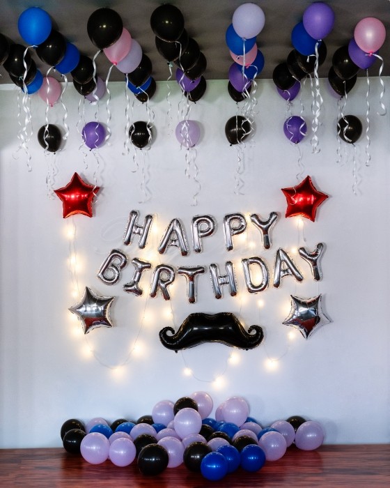 Celebrate in style with the Gentleman Mustache Theme Birthday Balloon Decoration, a classy and fun birthday decoration setup perfect for men and boys. Designed with bold colors like black, blue, purple, and silver, this decoration creates a stylish party vibe with a playful gentleman theme.
