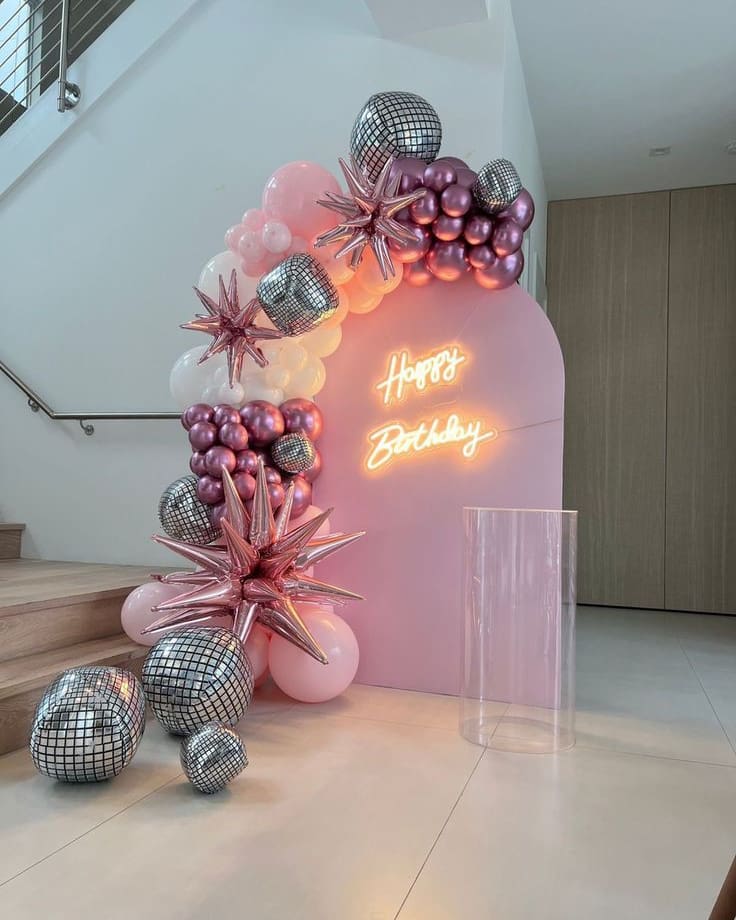✯✯This modern and stylish birthday balloon decor combines soft pink, metallic rose gold, and silver disco elements for a chic and glamorous celebration. The asymmetrical balloon arch is set against a pastel pink panel bac...