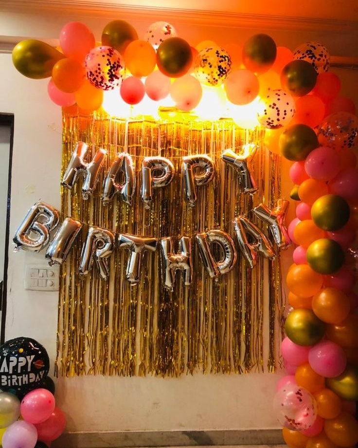 ✯✯This luxurious and vibrant birthday backdrop features a bold gold and silver theme with a striking balloon arch. The silver "HAPPY BIRTHDAY" foil letter balloons stand out against a shimmering gold tinsel curtain, making it perfect for ...