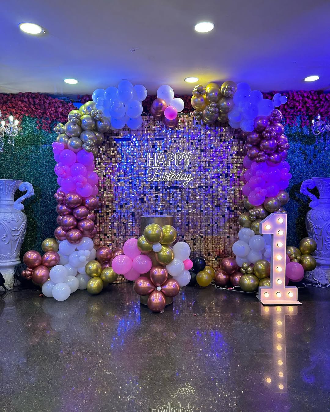 ✯✯This luxurious birthday backdrop features a gold sequin panel with a glowing "Happy Birthday" neon sign as the focal point. A grand balloon arch in gold, rose gold, white, and pastel pink elegantly frames the setup, creating a stunning visual appeal. A large illuminated number "1" marquee highl...