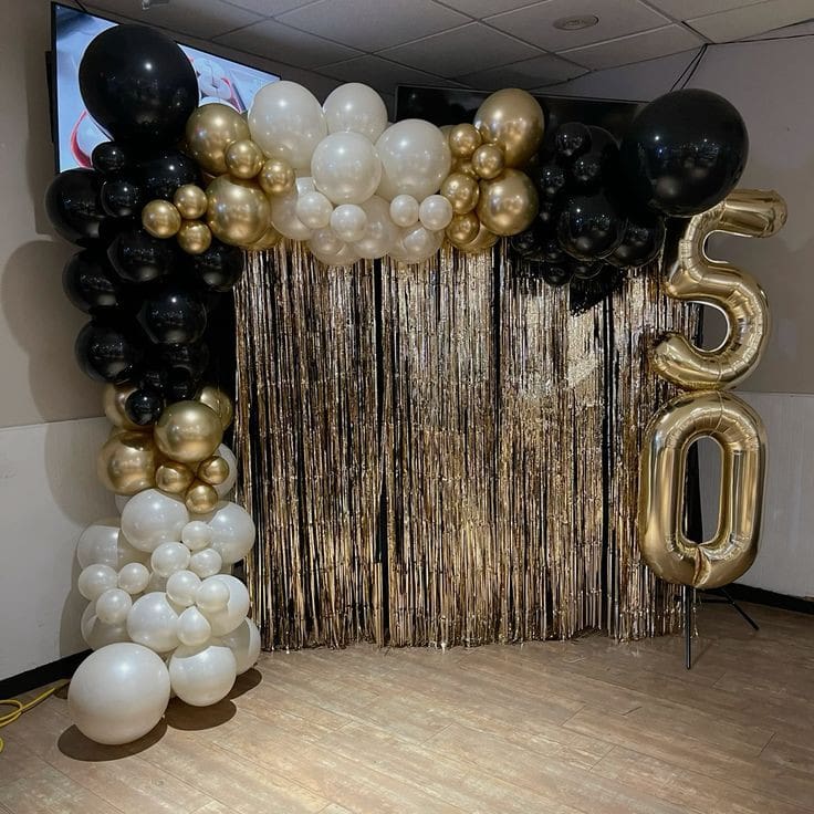 ✯✯This luxurious black, gold, and white-themed balloon setup is designed for milestone birthdays and celebrations such as 50th, 60th, or 70th birthdays, anniversaries, or corporate events. The gold foil fringe curtain backdrop cr...