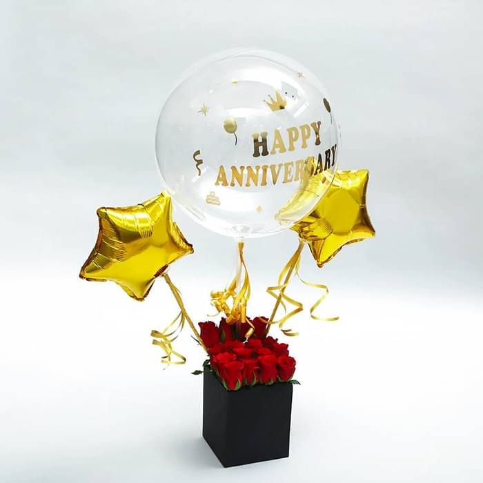 This is a luxurious anniversary decoration piece that features a clear bubble balloon with "Happy Anniversary" written in gold, paired with gold star foil balloons and a box of fresh red roses. The elegant design makes it a perfect gift or table centerpiece for anniversaries, romantic celebration...