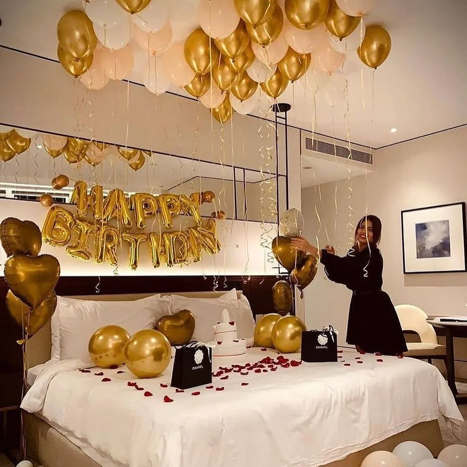 *️⃣This luxurious birthday decoration is designed for an intimate and elegant celebration, featuring a stunning gold and white color scheme. The floating ceiling balloons, heart-shaped foil balloons, *️⃣and "HAPPY BIRTHDAY" letter balloons create a dreamy and romantic ambiance, perfect for hotel ...
