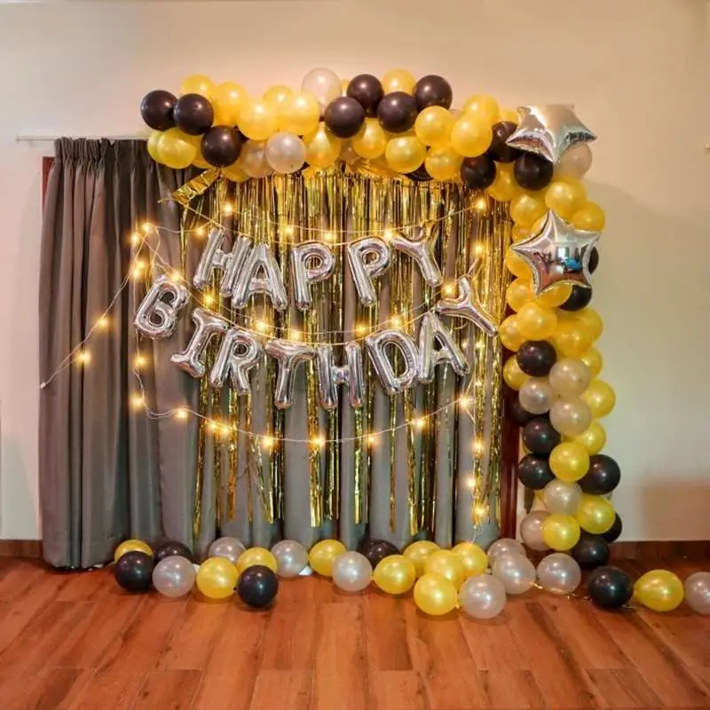 This stylish Golden, Black & Silver Birthday Setup is a perfect blend of elegance and celebration. Designed for adults, teens, or even milestone birthdays, this decoration features a combination of bold and classy colors with metallic elements, fairy lights, and a shimmering backdrop for a gl...