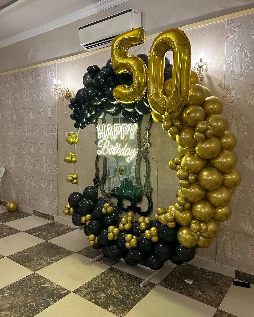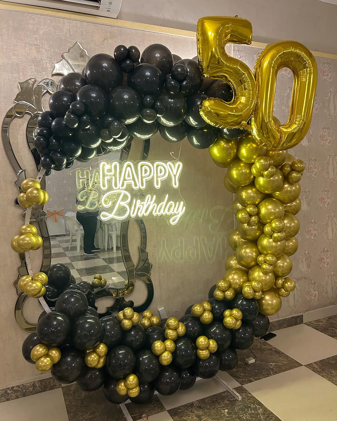 This sophisticated and classy 50th birthday decoration features a black and gold balloon garland arranged in a semi-circle on a mirror backdrop. A glowing "HAPPY BIRTHDAY" neon sign adds a luxurious touch, while the golden "50" foil balloons highlight the milestone celebration. This minimal yet g...