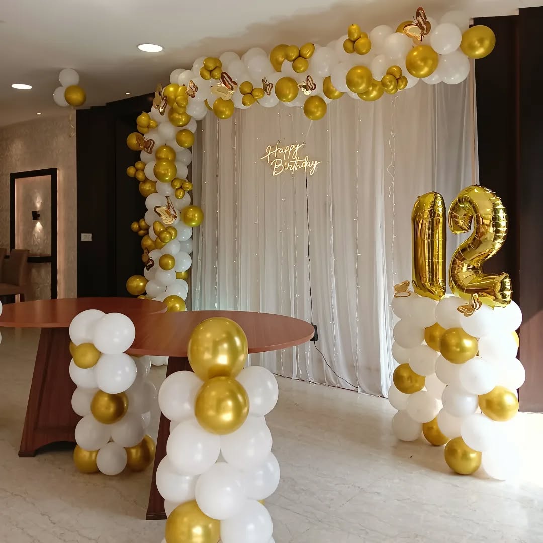 The Golden Daisy Birthday Arch is a charming and elegant decoration, designed primarily for birthdays and celebratory events. It features a balloon arch made with white and gold balloons, embellished with balloon daisies and golden butterfly accents. The focal point is the golden number "12" ball...