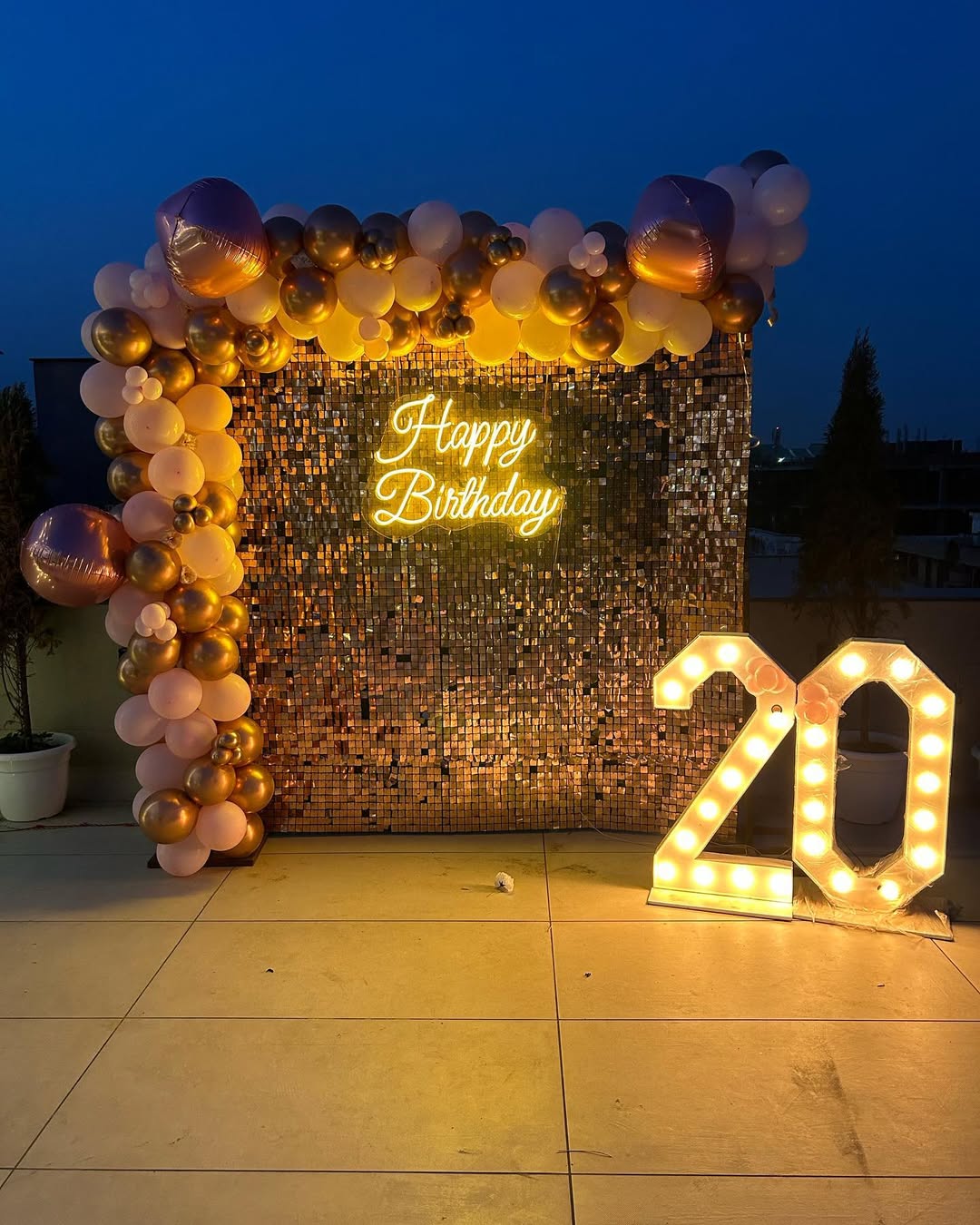 This modern and elegant birthday backdrop features a golden sequin wall, a balloon garland in rose gold, gold chrome, and white, and a custom LED neon sign reading "Happy Birthday." The illuminated marquee number "20" adds a personalized touch, making it perfect for milestone birthdays.