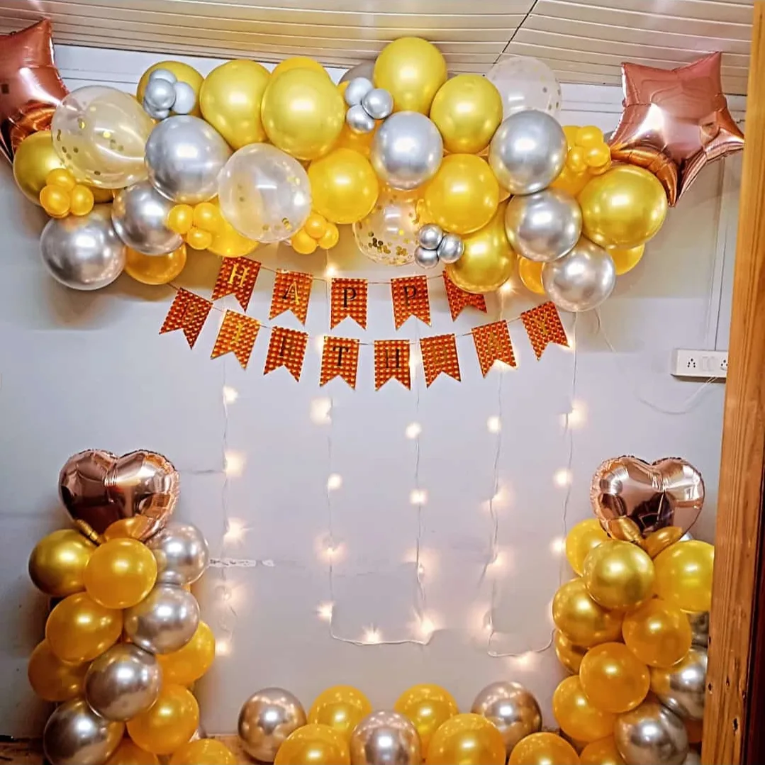 *️⃣The "Golden Glow Celebration" setup is a warm, festive, and elegant golden-themed backdrop perfect for birthdays, anniversaries, or festive events. The combination of gold, silver, and rose *️⃣gold balloons with fairy lights creates a luxurious yet cozy ambiance