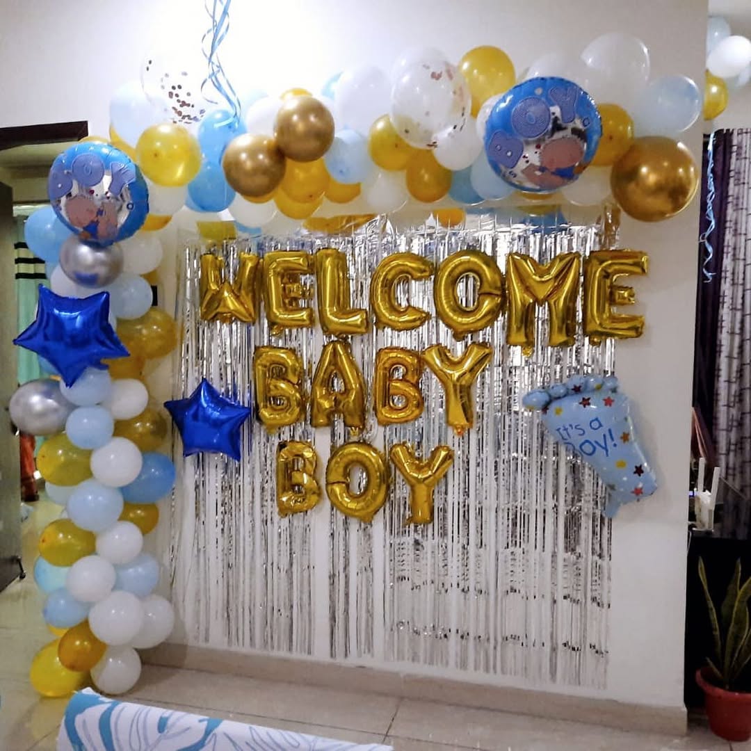 This adorable baby boy welcome decoration features a combination of gold, blue, white, and transparent balloons arranged into an arch with gold foil letter balloons spelling out "WELCOME BABY BOY." The silver tinsel backdrop adds a sparkling and festive touch. Complementary star-shaped bl...