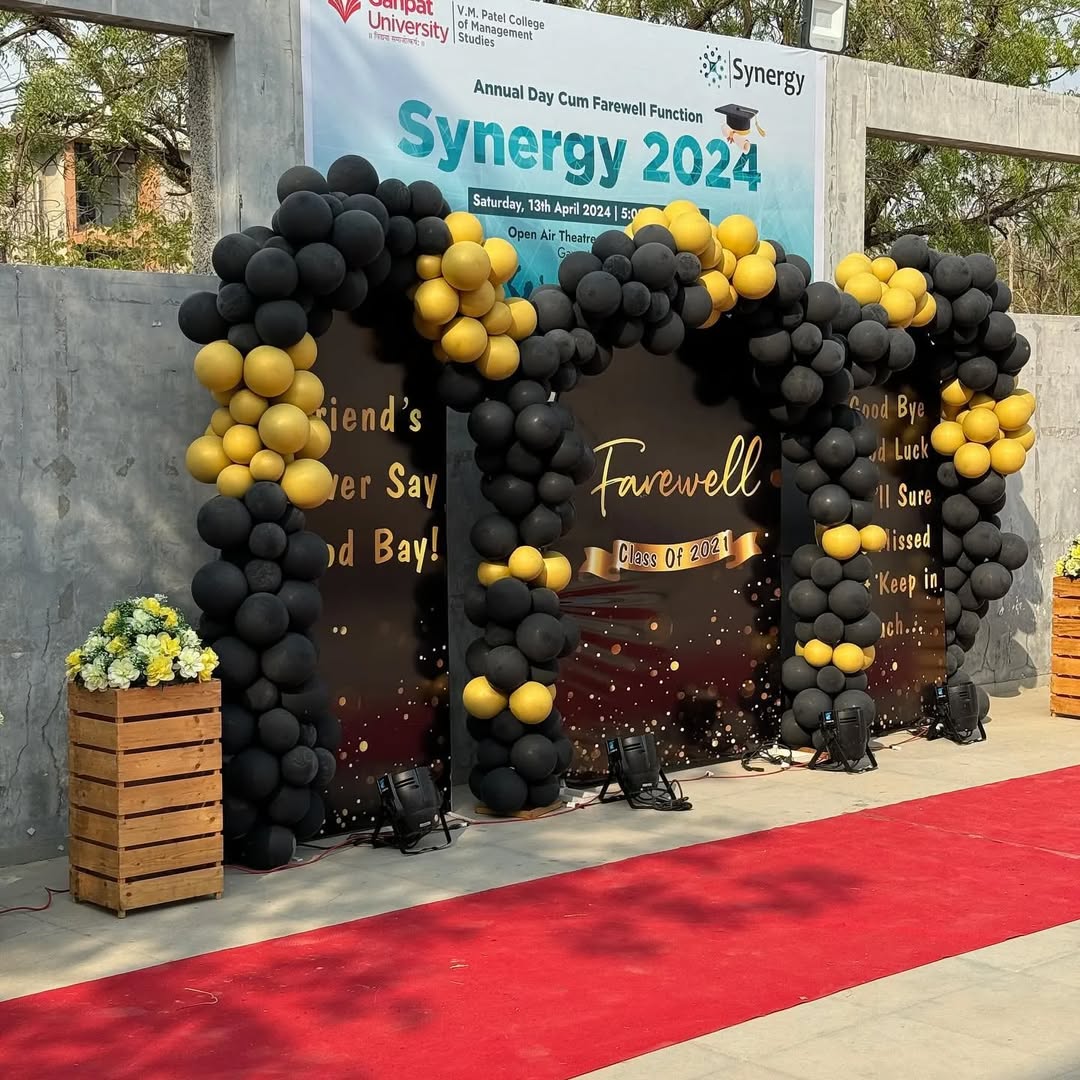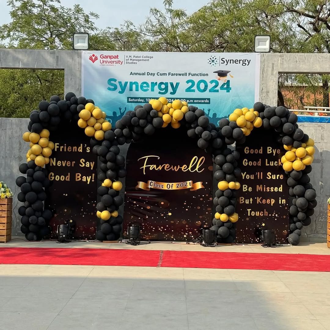 This elegant farewell decor is designed for college and school farewell events, combining a bold black and gold theme to create a memorable send-off. The setup includes: