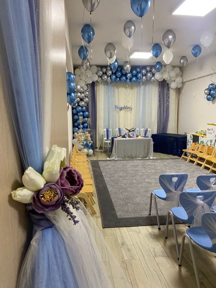 This blue and silver themed decoration creates a calm, elegant, and welcoming atmosphere that is perfect for intimate celebrations. The soft blue tones combined with metallic silver balloons give the space a modern and premium look without being overwhelming. The floating ceiling balloons add a s...