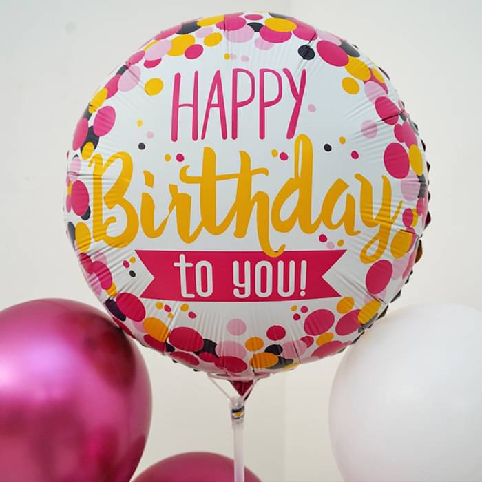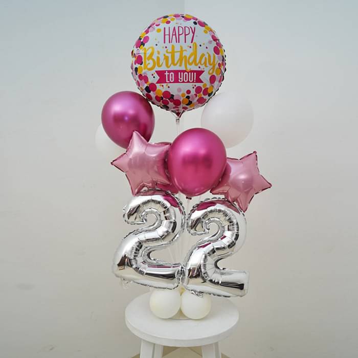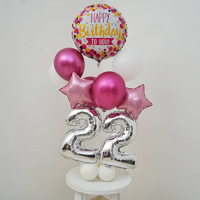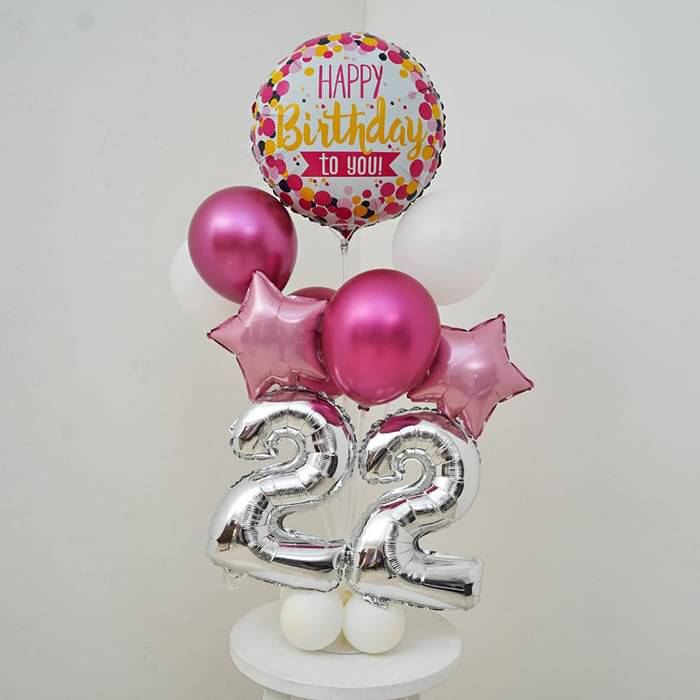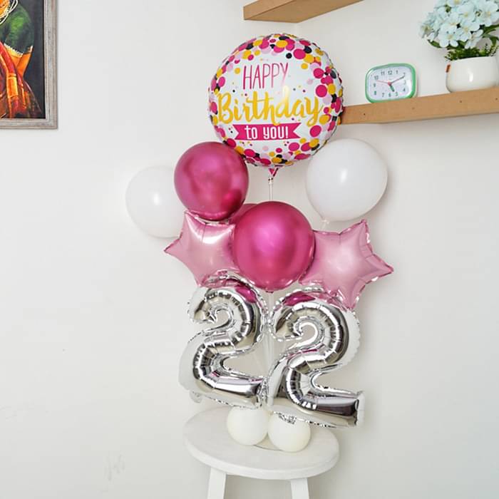 A cheerful and stylish birthday balloon arrangement designed to make any celebration extra special. This setup features a "Happy Birthday to You" foil balloon, number balloons displaying "22", and a mix of white, pink, and metallic balloons, creating an elegant and fun birthday decor.